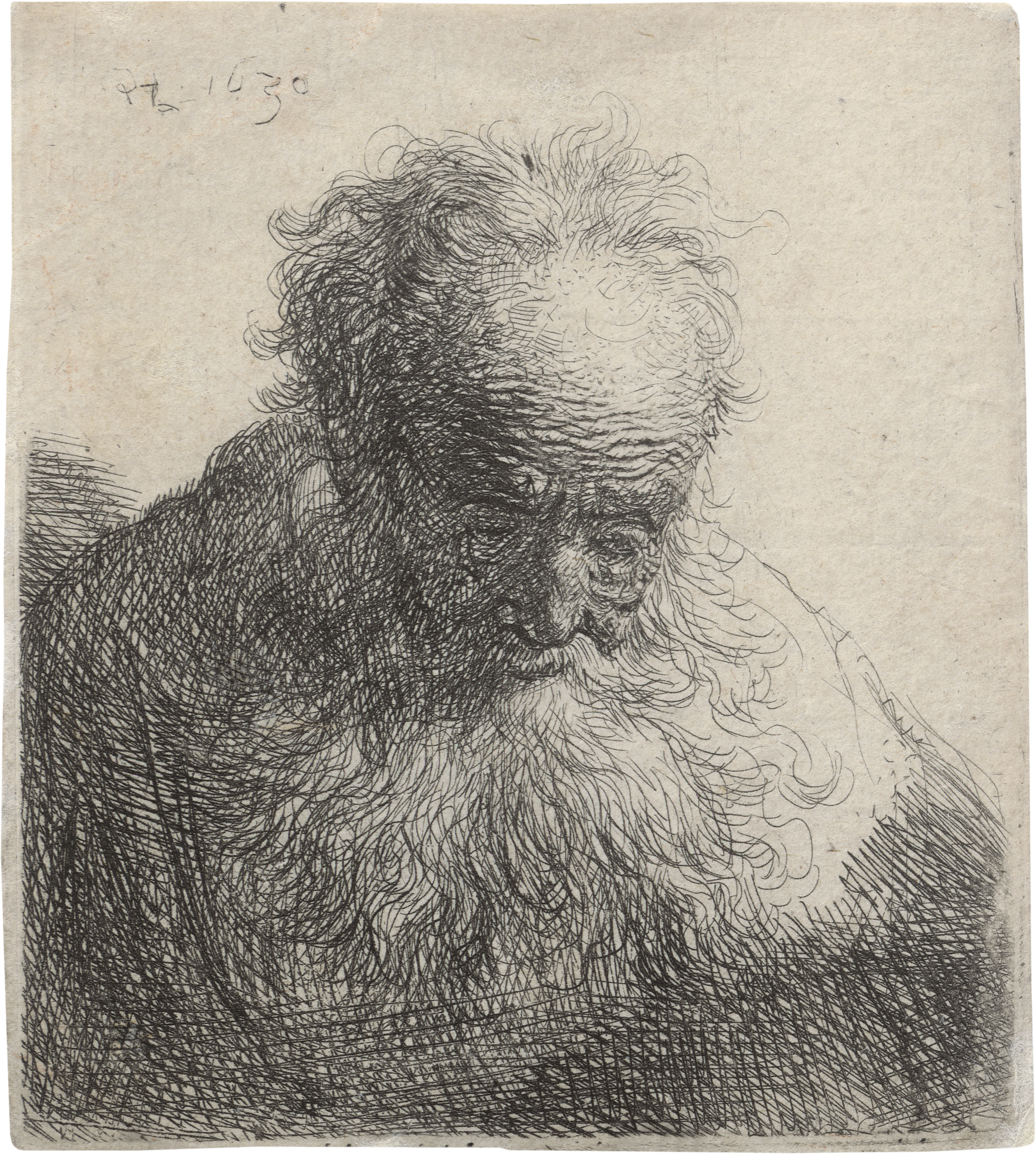 Greis mit langem Bart, stark vorgebeugt. Radierung. 8,6 x 7,6 cm. 1630. B. 325, White/Boon (Hollstein) 325, Nowell-Usticke 325, Hinterding/Rutgers (New Hollstein) 64. Wz. Lilie (Fragment, obere Spitze eines Straßburger Lilienwappens).