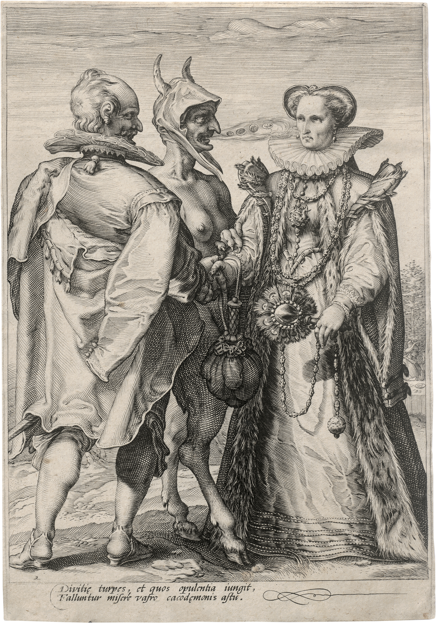Die Vermählung des Reichtums. Kupferstich nach Hendrick Goltzius. 23,3 x 16,1 cm. Um 1595. B. 85, Hollstein 108, Leesberg (New Hollstein) 526. Wz. Bekrönter Doppelkopfadler.