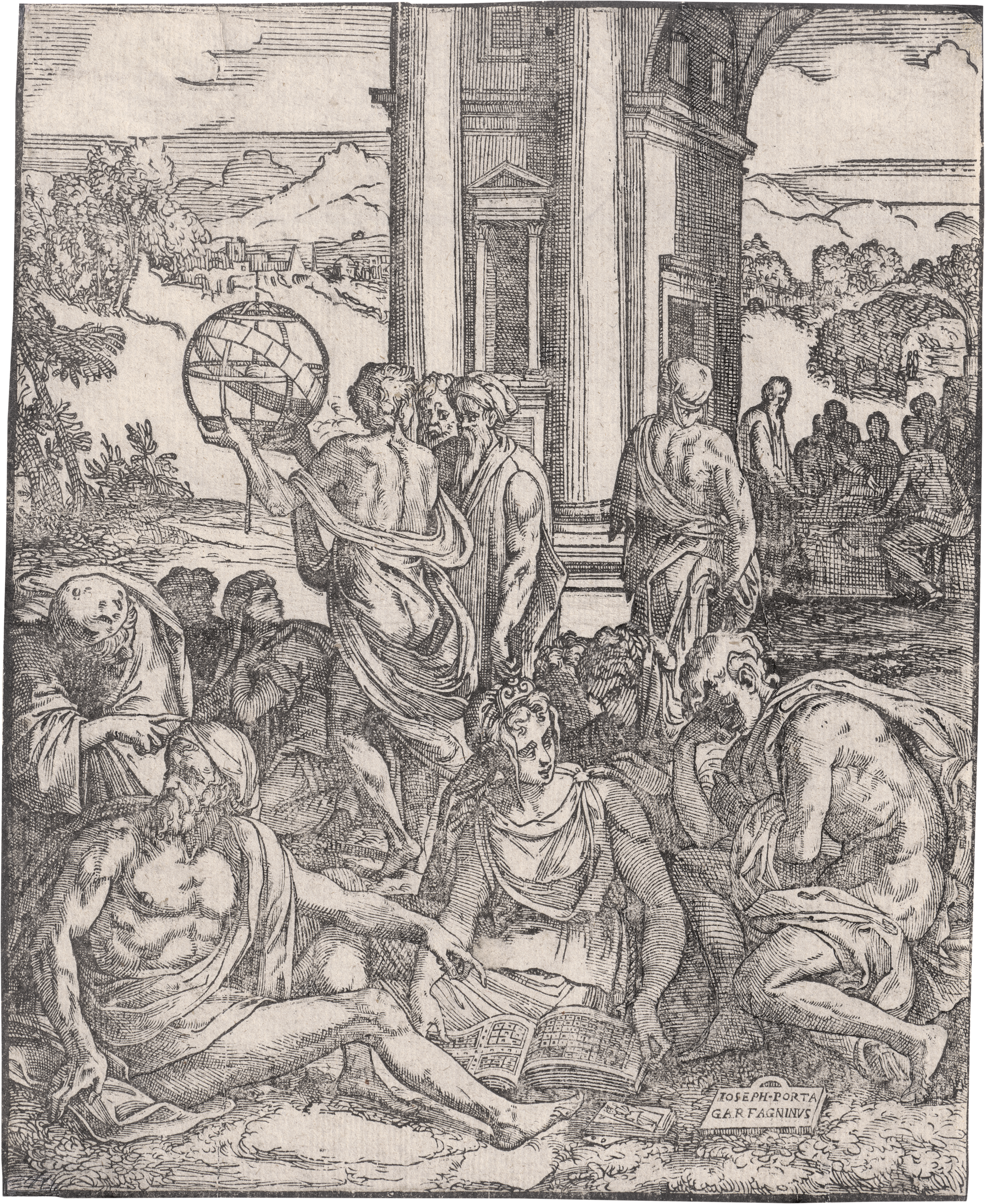 Der Maler und Zeichner Giuseppe Salviati, eigentlich Porta, wurde 1535 Schüler von Francesco Salviati, dessen Namen er annahm. Er begleitete seinen Lehrer 1539 nach Venedig, wo er von den Grimani protegiert wurde und zahlreiche öffentliche Aufträge erhielt. Es handelt sich um eine arkadische Variante der "Schule von Athen". Einige Astrologen betrachten die Himmelssphäre, während vorne Philosophen sich dem Bücherstudium widmen. Ausgezeichneter, gleichmäßiger Druck mit der Einfassungslinie. Minimale Altersspuren, sonst vorzüglich erhalten. Selten.