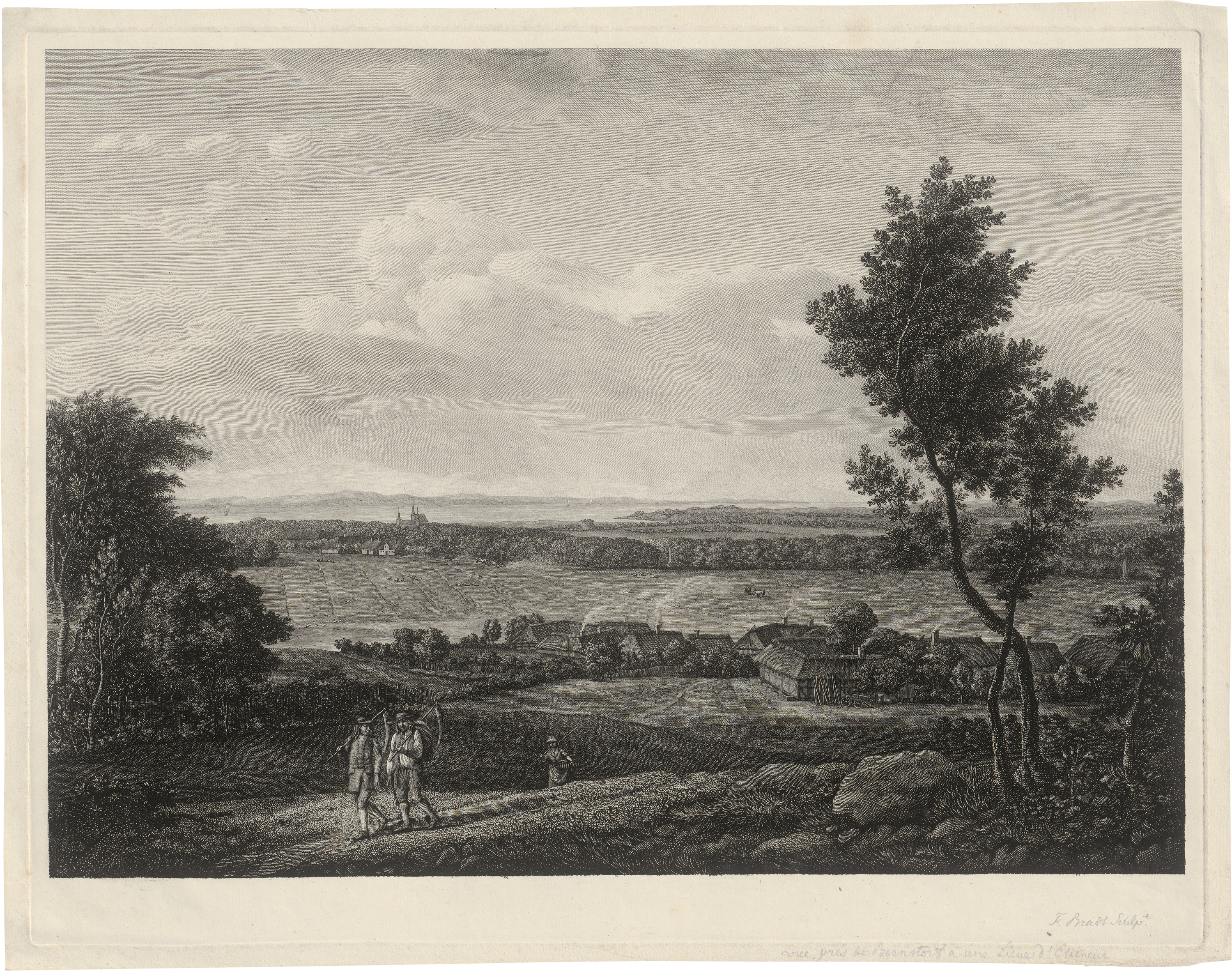 Weite Landschaft bei Jaegerpris, mit Bauern auf dem Felde - Prospekt af egnen om Jægerspris. Radierung und Kupferstich nach Jens Juel. 39,8 x 51,3 cm. (1782). Le Blanc wohl 1 oder 2. Wz. Schrift über drei Reihen.