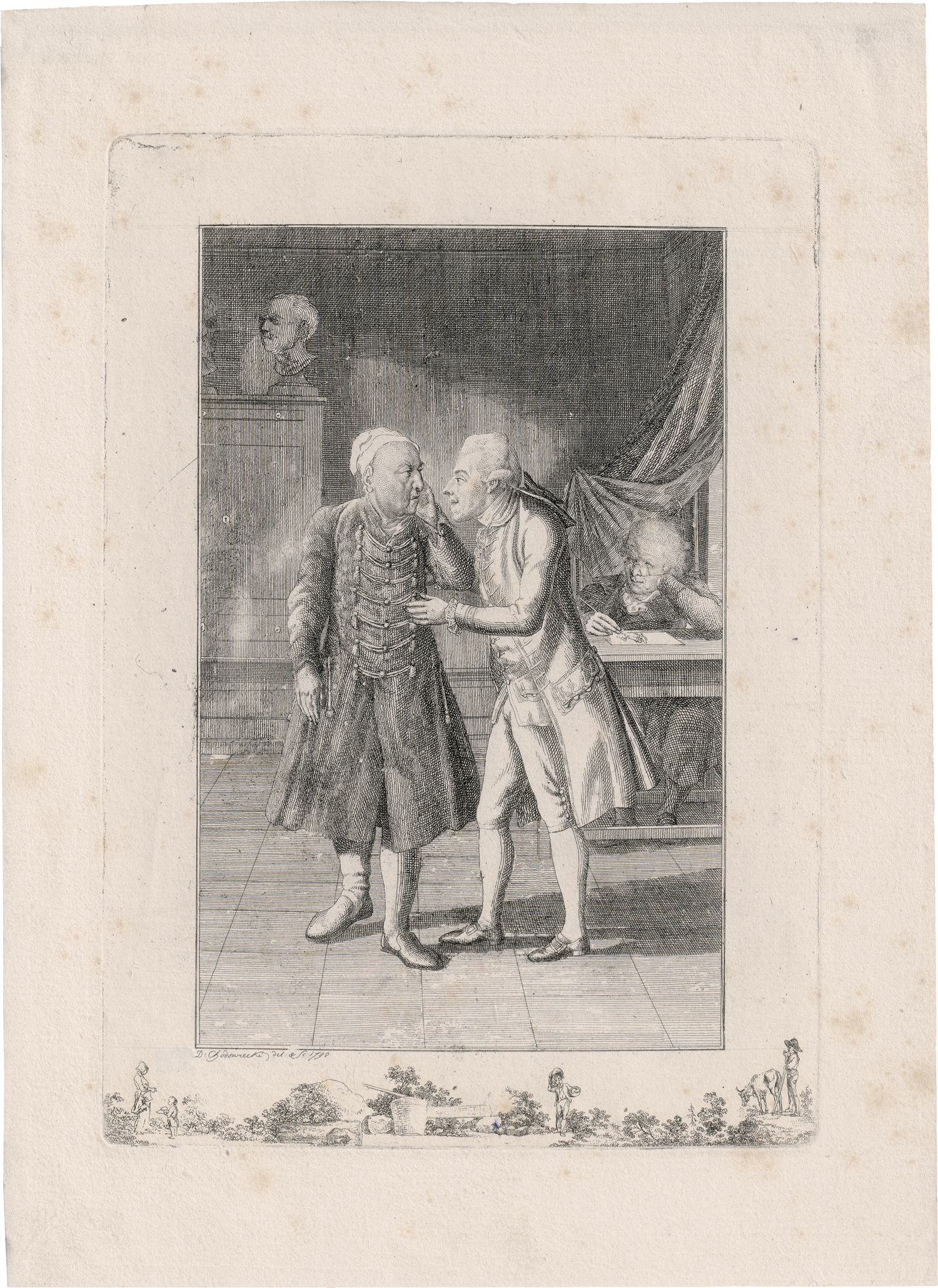 Am 3. November 1773 besucht Chodowiecki, gemeinsam mit seinem Freund, dem Künstler Adrian Zingg, die Wohnung des Antiquars Philipp Daniel Lippert in Dresden. Ähnlich wie in seiner Radierung Cabinet d'un peintre von 1772 zeigt sich Chodowiecki hier rechts in der hinteren Ecke und beobachtet die Szenerie. Lippert, von dem es heißt, er habe schlecht gehört, greift sich zum besseren Verständnis ans Ohr, Zingg scheint ihm etwas zu erläutern. 1773 hielt Chodowiecki das Zusammentreffen fest, doch entstand die Radierung erst 25 Jahre später. Vermutlich eine neuerliche Reise im Jahre 1798 nach Dresden, die er unter anderem mit Anton Graff und Adrian Zingg unternahm, ließ Chodowiecki den Entschluss fassen, die Radierung als Zeugnis der langjährigen Freundschaft mit Zingg auszuführen. Unser Abzug stammt von der ersten, kleineren, unvollendeten und verätzten, später verworfenen Platte. Chodowiecki gab diesen ersten Radierversuch auf, da ihn vermutlich die Zeichnung und Probleme im Ätzprozess nicht überzeugten. Abzüge dieser frühen, verworfenen Fassung sind extrem selten.