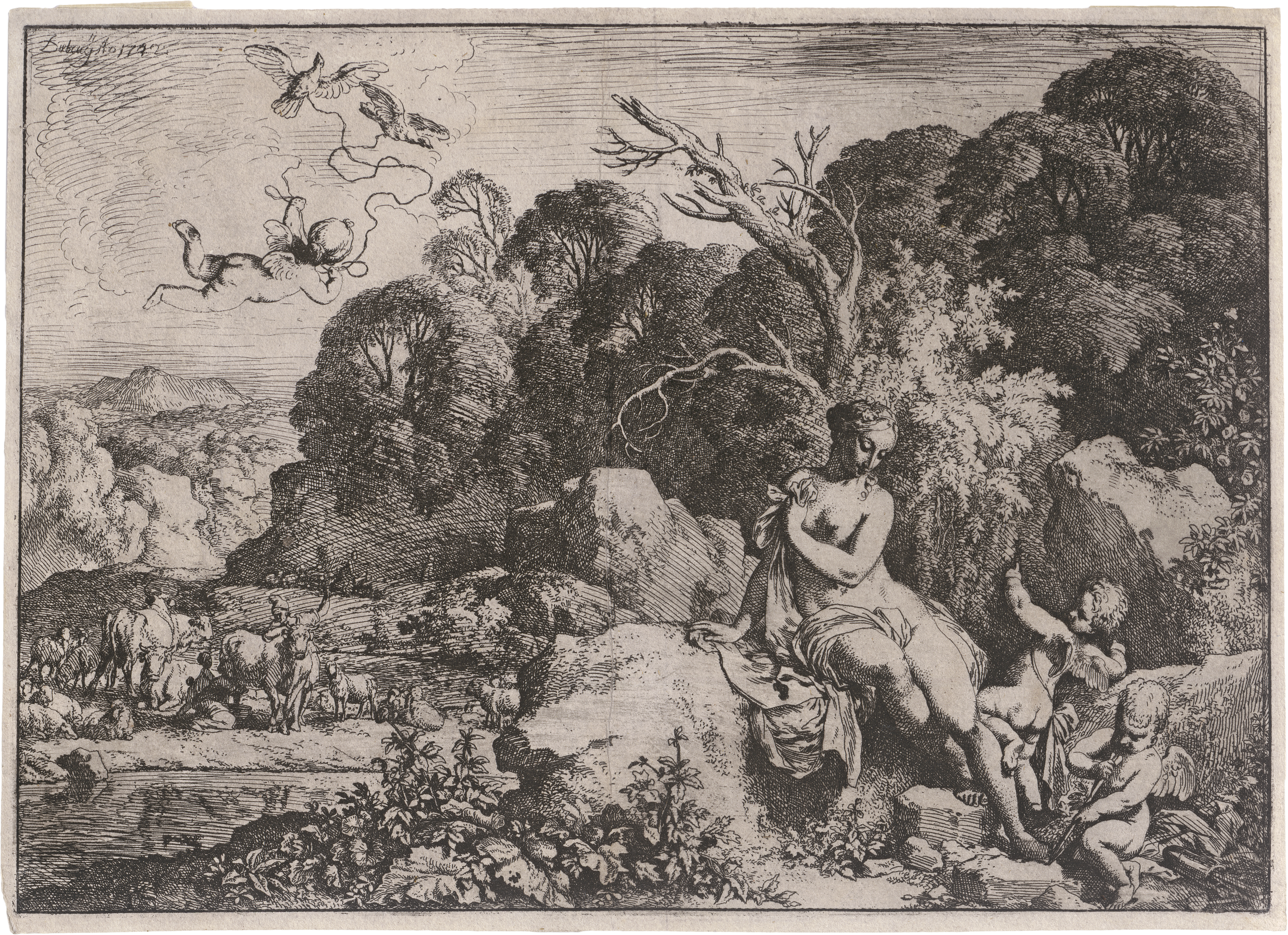 Venus mit den Liebesgöttern in einer Landschaft. Radierung. 18,9 x 26,7 cm. 1742. Linck 137 II (von IV).