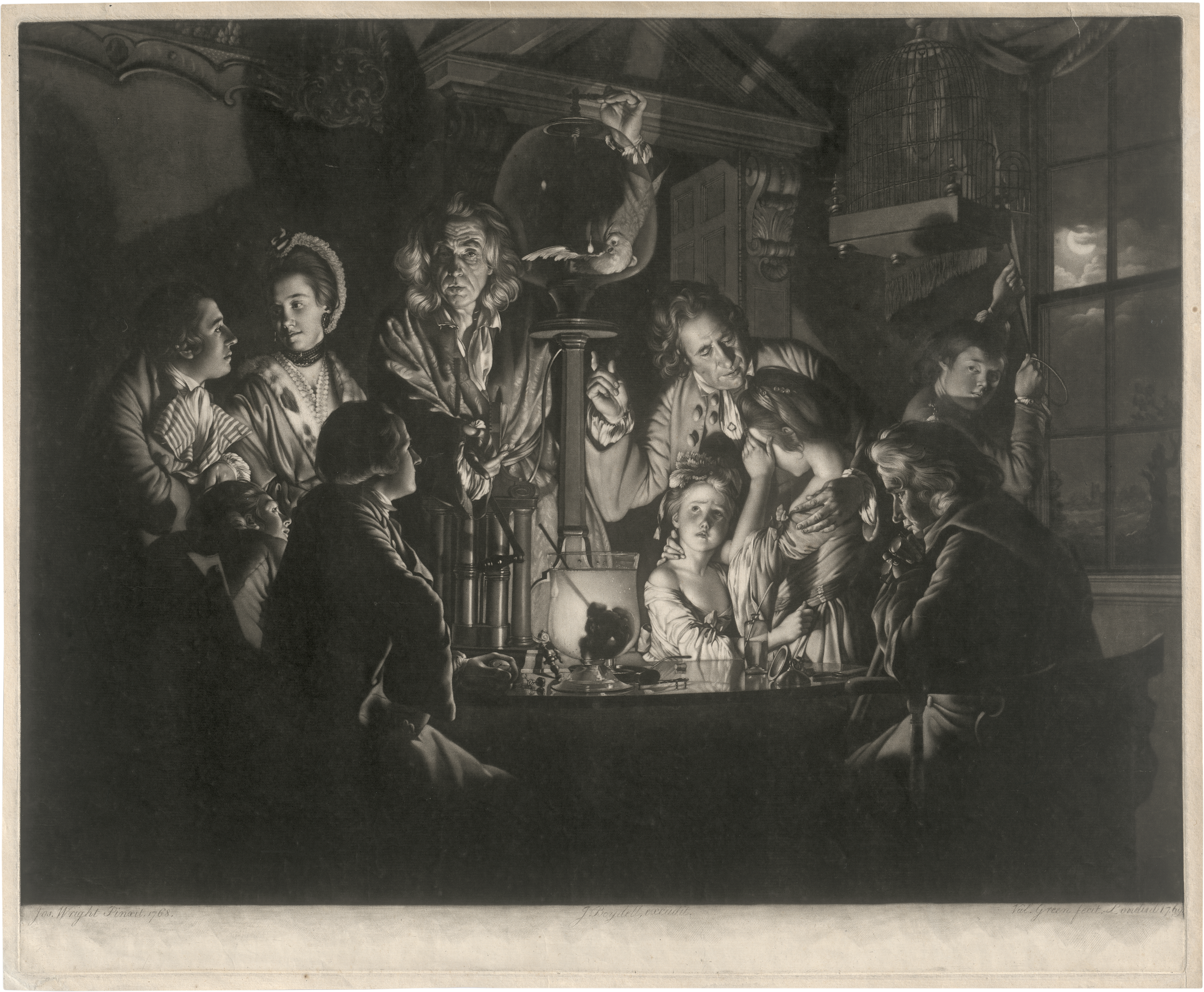Das Experiment mit der Luftpumpe. Schabkunstblatt nach Joseph Wright of Derby. 47,9 x 58,6 cm. 1769. Chaloner-Smith 163 I (von II), Egerton (in: Joseph Wright of Derby, Ausst.Kat. London 1990) P2 II (von IV). Wz. Kreuz mit Beizeichen im Oval.
