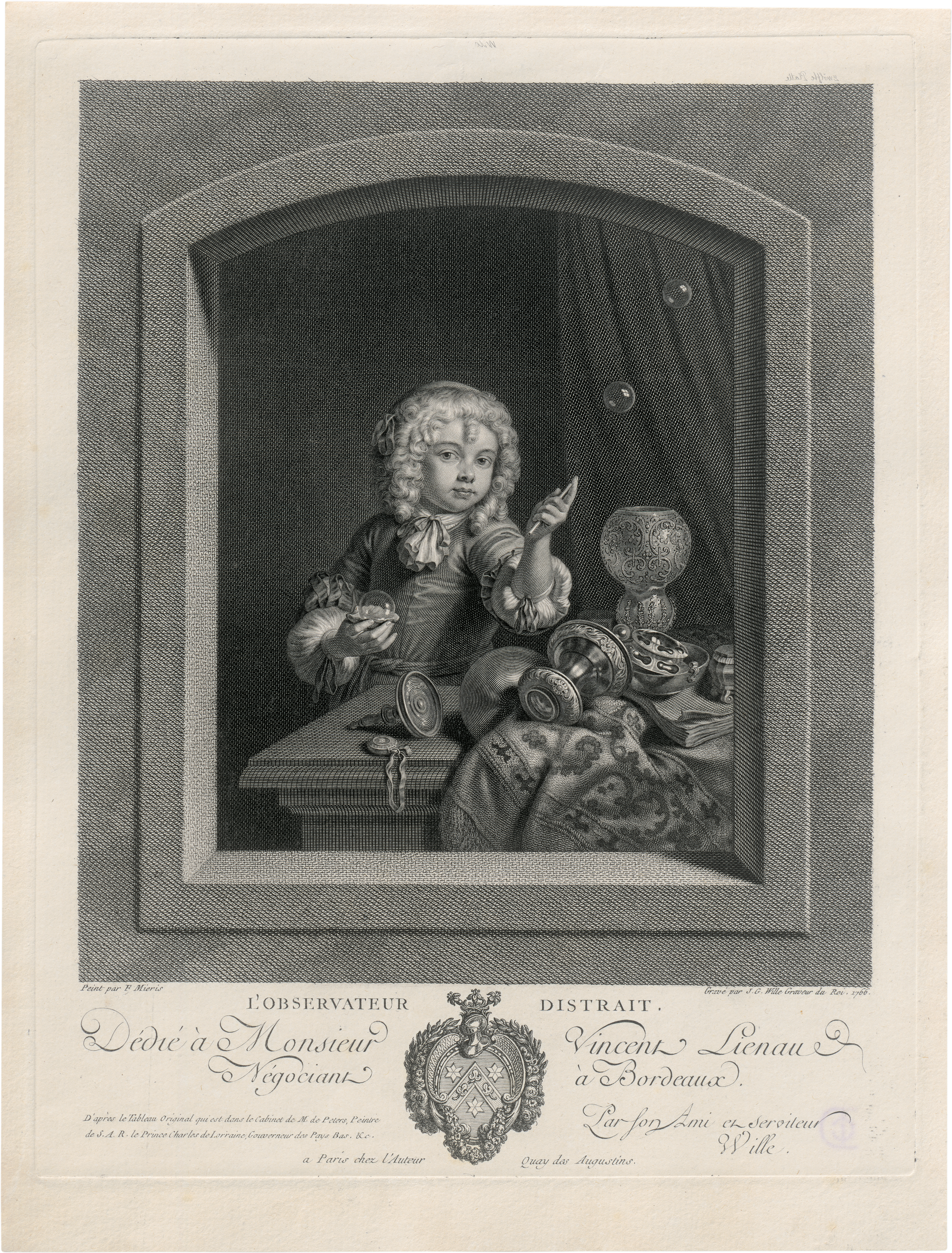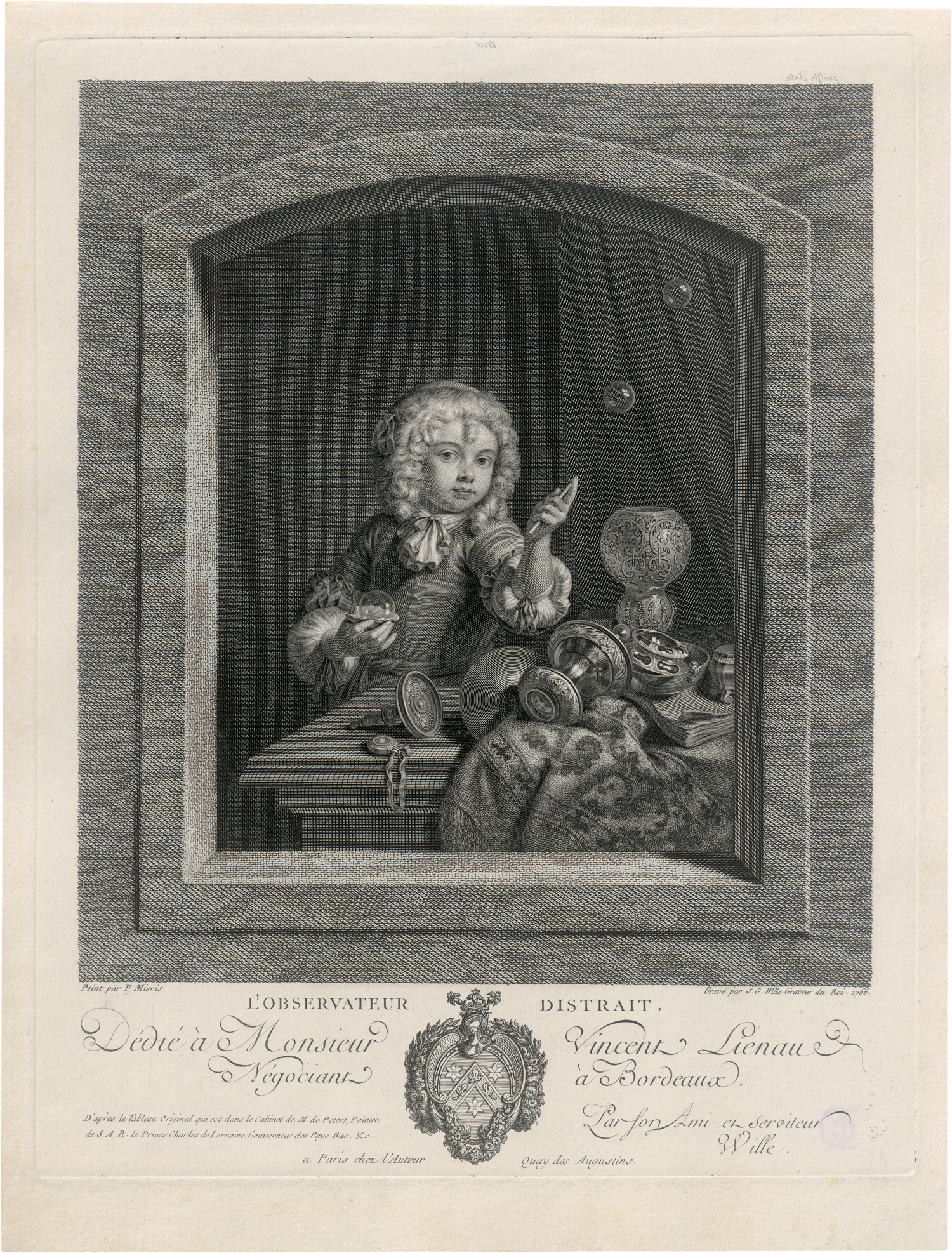 L'observateur distrait: Junger Knabe, der Seifenblasen bläst. Kupferstich nach Frans van Mieris. 28,8 x 22,3 cm. 1766. Nagler 169 III.