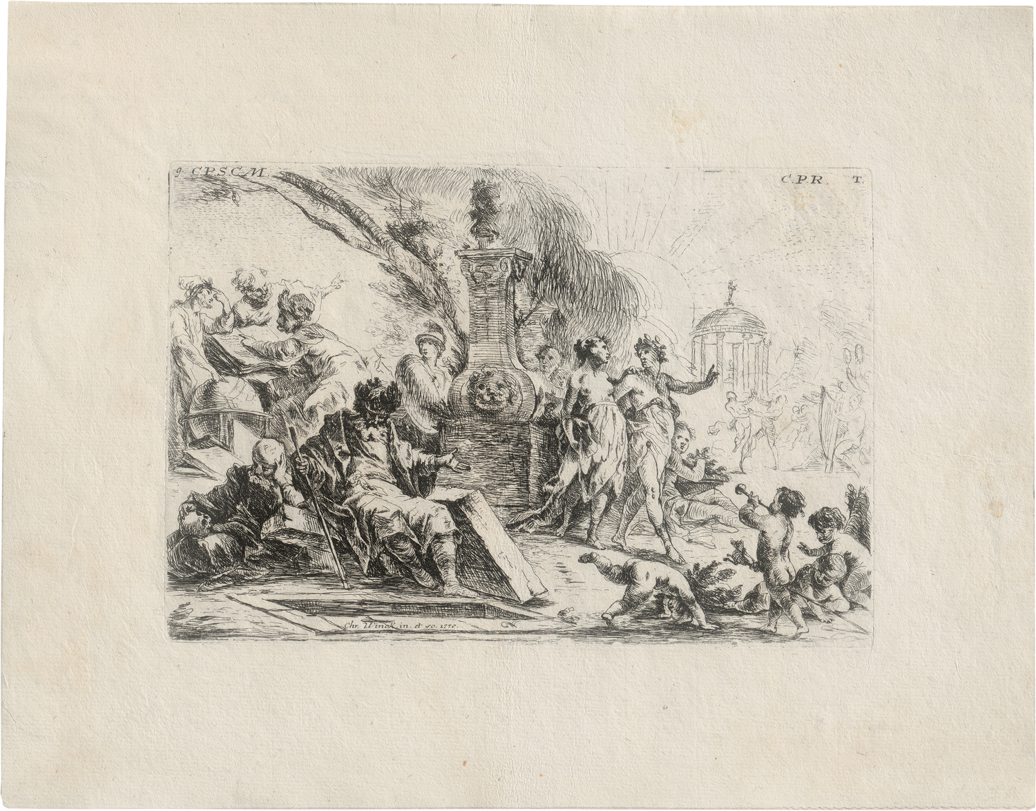 Von Johann Christian Winck, dem meistbeschäftigten Münchener Freskant der zweiten Hälfte des 18. Jahrhunderts, sind insgesamt nur sieben eigenhändige Radierungen bekannt, die schon Nagler als selten beschreibt. Prachtvoller, herrlich nuancierter Druck mit breitem Rand um die deutlich zeichnende Plattenkante. Zarte vertikale Trockenfältchen, oben links eine diagonale Quetschfalte, blasse Flecken überwiegend im weißen Rand, sonst vorzüglich.