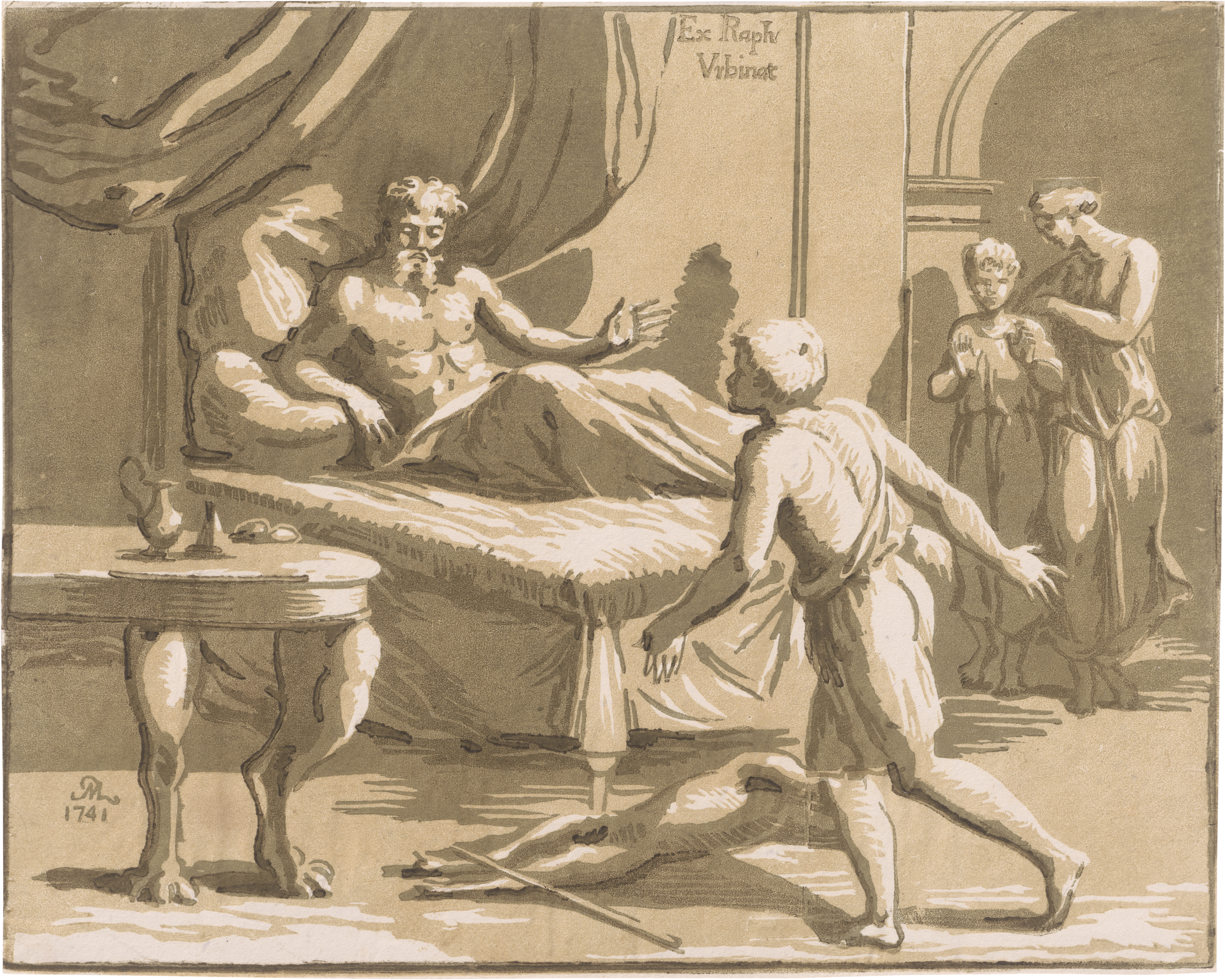 Isaak segnet Esau. Clair-obscur-Holzschnitt von vier Blöcken in Gelb, Braun, Hell- und Dunkelgrün, nach Raffael. 22 x 27,9 cm. 1741. B. 69. Wz. Tre Lune (Untersatzpapier).