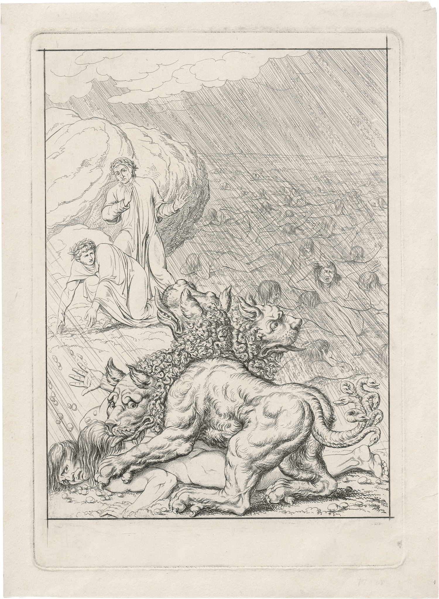 Im dritten Höllenkreis treffen Dante und Vergil auf die Seelen der Gefräßigen, die im eisigen Regen auf dem Boden liegen und vom Höllenhund Zerberos bewacht und geschunden werden. Vergil gelingt es, den Höllenhund mit einer Hand voll Erde zu besänftigen (Inferno, Canto VI). Illustration von Lasinio Figlio nach Luigi Ademollo - die deutlich den Einfluss Luigi Sabatellis offenbart - zu Dante Allighieris "La Divina Commedia", 1817-19 in Florenz verlegt. Ganz ausgezeichneter, klarer Druck vor aller Schrift und den Namen der Künstler. Mit schmalem Rand um die gratig zeichnende Plattenkante, mit zahlreichen Nadelproben. Geringfügig angestaubt und nur leichte Gebrauchsspuren, verso braune Klebereste, sonst tadellos.