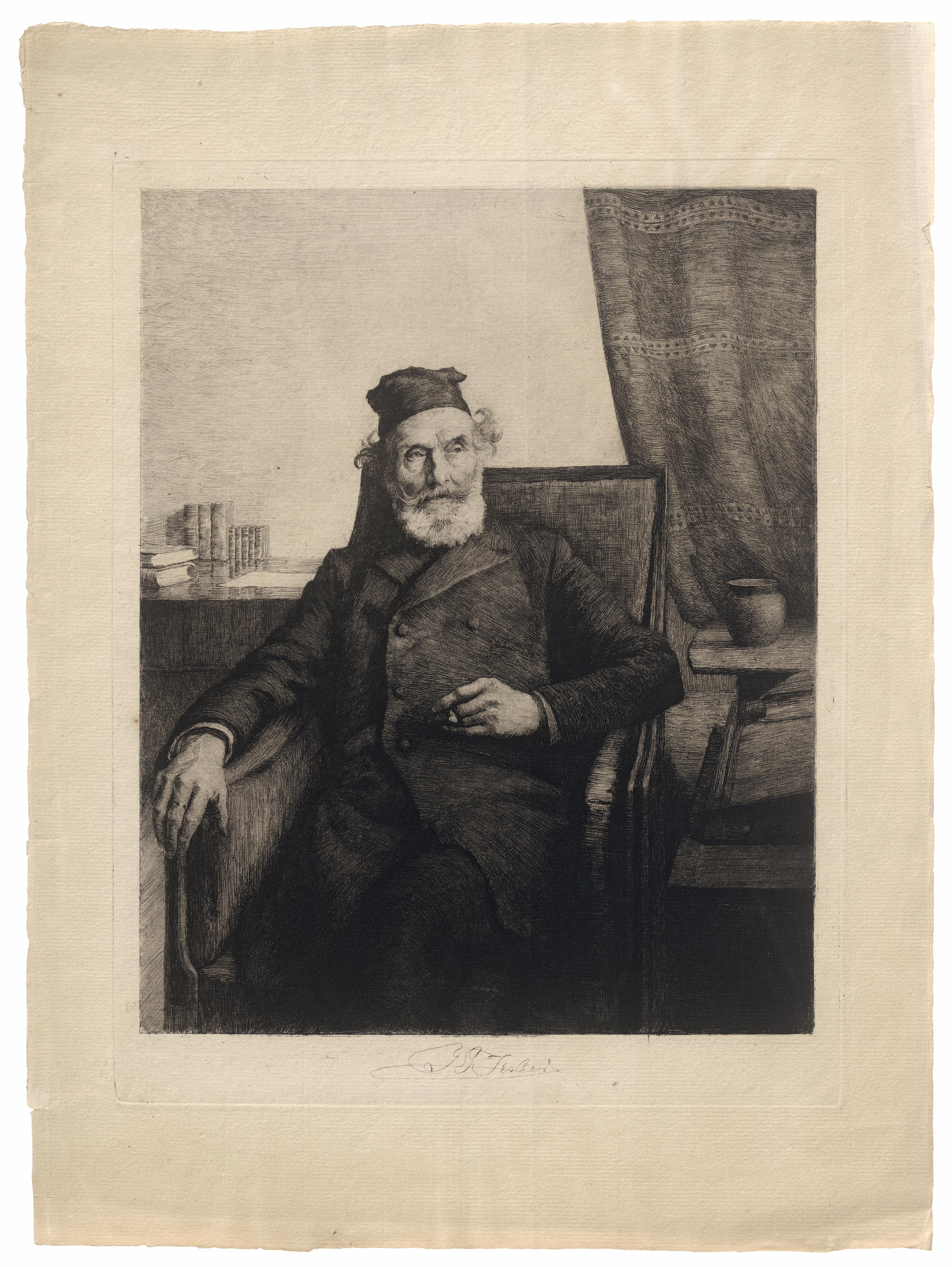 Ganz ausgezeichneter, toniger Druck des seltenen Porträts mit schmalem Rand, links und oben mit Schöpfrand. Insgesamt etwas vebräunt, eine Vertikalfalte, schwacher Diagonalknick in der Ecke unten links, gelegentliche Randbestoßungen, sonst in guter Erhaltung. Beigegeben von demselben das signierte und nummerierte Schabkunstblatt "Beim Großvater" (Olufsen-Svensson 7).