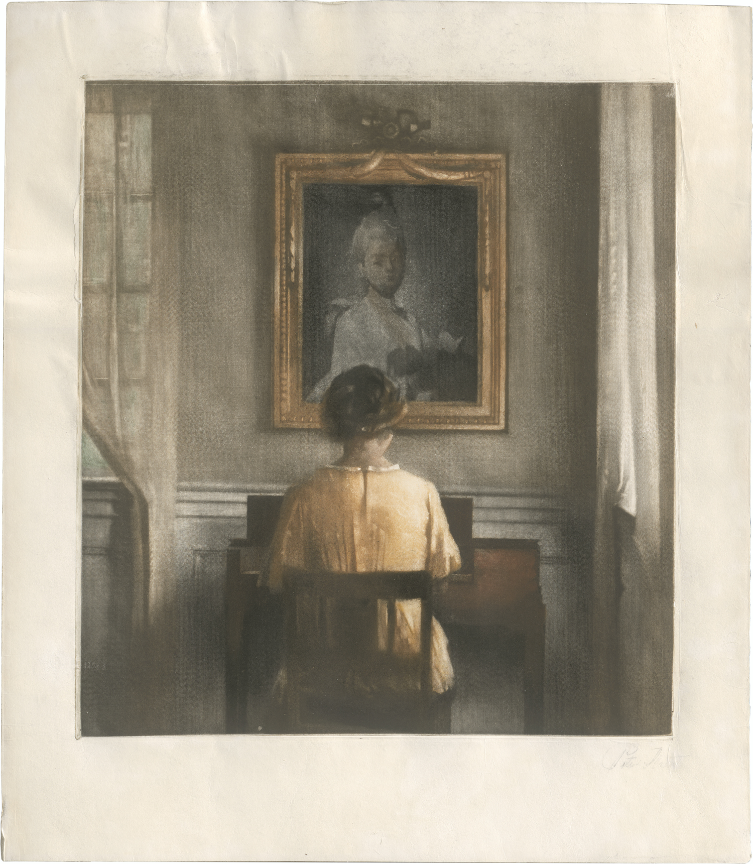 Am Spinett. Farbiges Schabkunstblatt auf China, aufgewalzt auf Similijapan. 35,9 x 32,4 cm. Signiert (verblasst). (1911). Olufsen-Svensson 10.