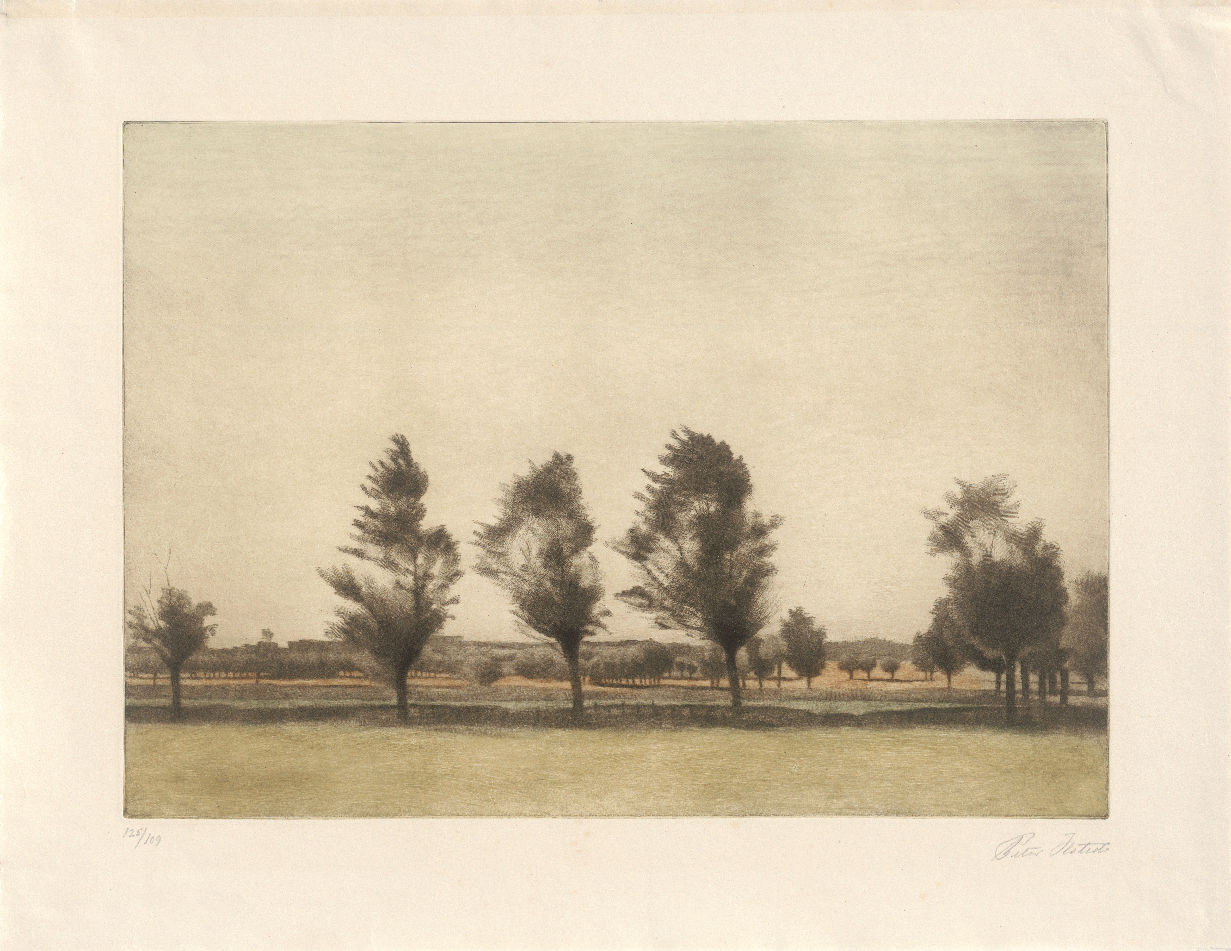 Ganz ausgezeichneter, atmosphärischer Druck mit Rand. Die oberen Ecken minimal knitterspurig, die Blattoberkante zart verbäunt, punktuell blasse Stockflecken im Unterrand, sonst in sehr schöner Erhaltung.