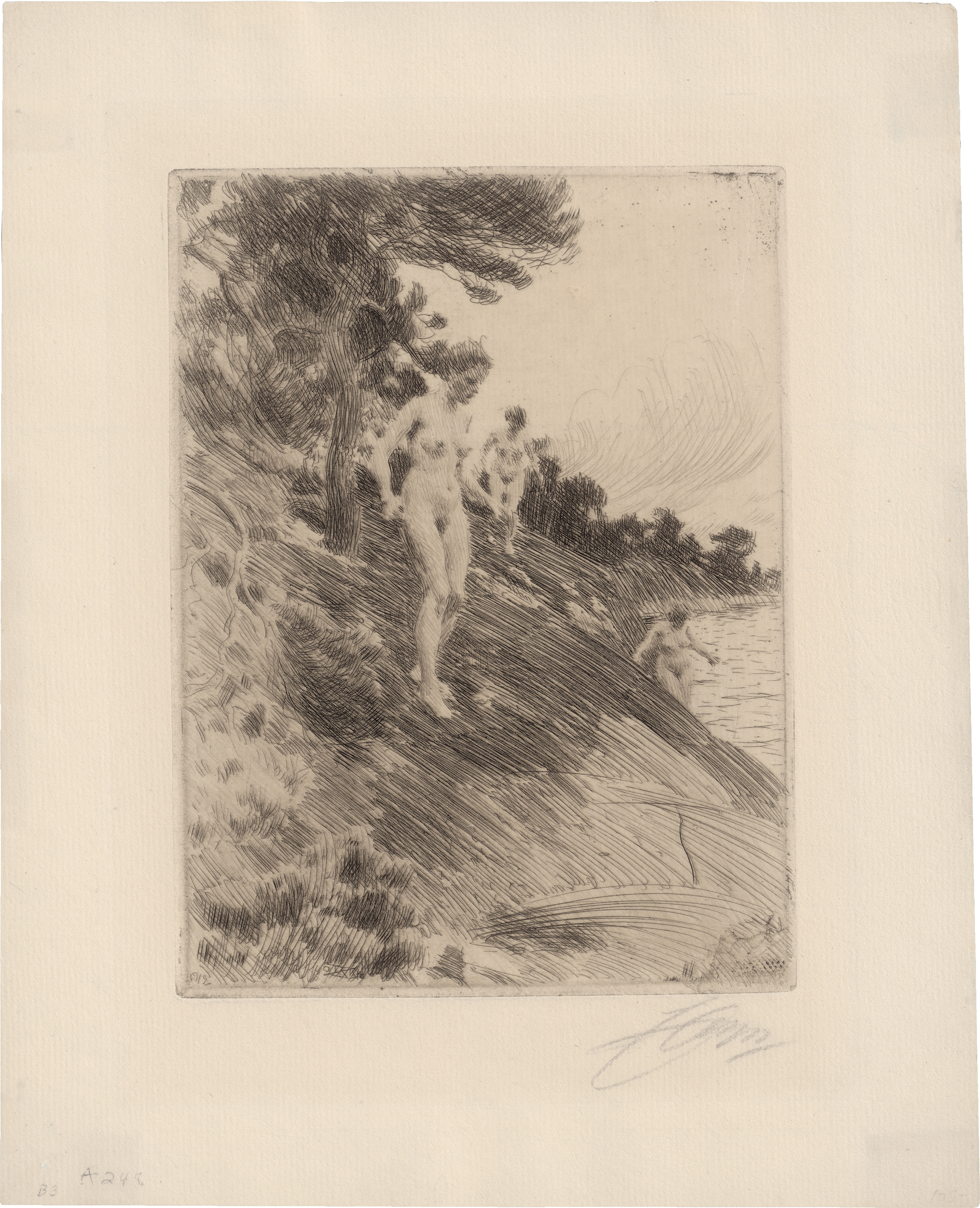 Erschrocken. Kaltnadelradierung. Signiert. 1912. Asplund 248, nicht in Delteil, Lidbeck ZG 248 II. Wz. Bekröntes Wappen (Krone, Fragment).