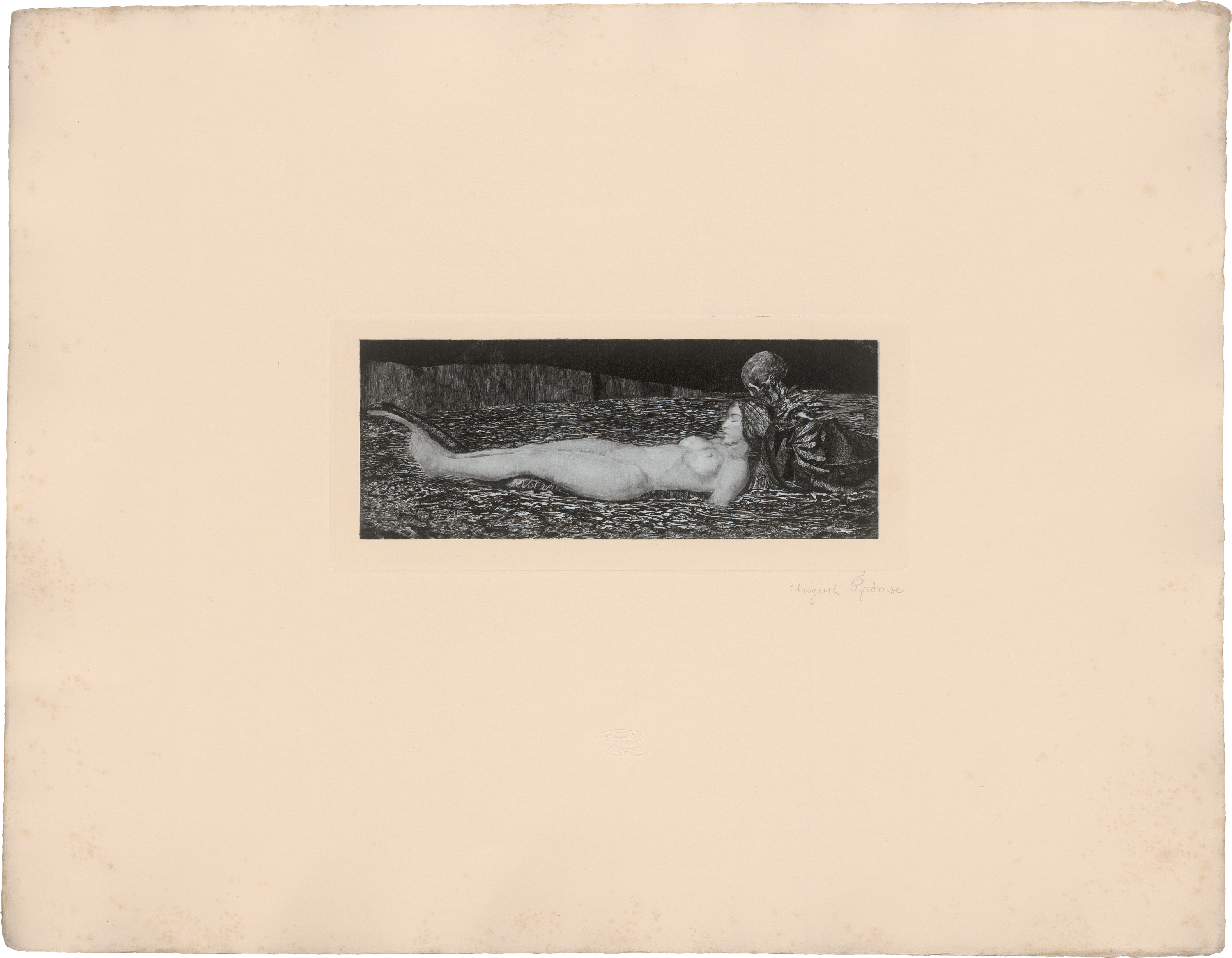 "Eine Todte". Radierung auf hellblauem, gewalztem China. 13,1 x 29,8 cm. Bezeichnet "August Brömse". (1902/03).