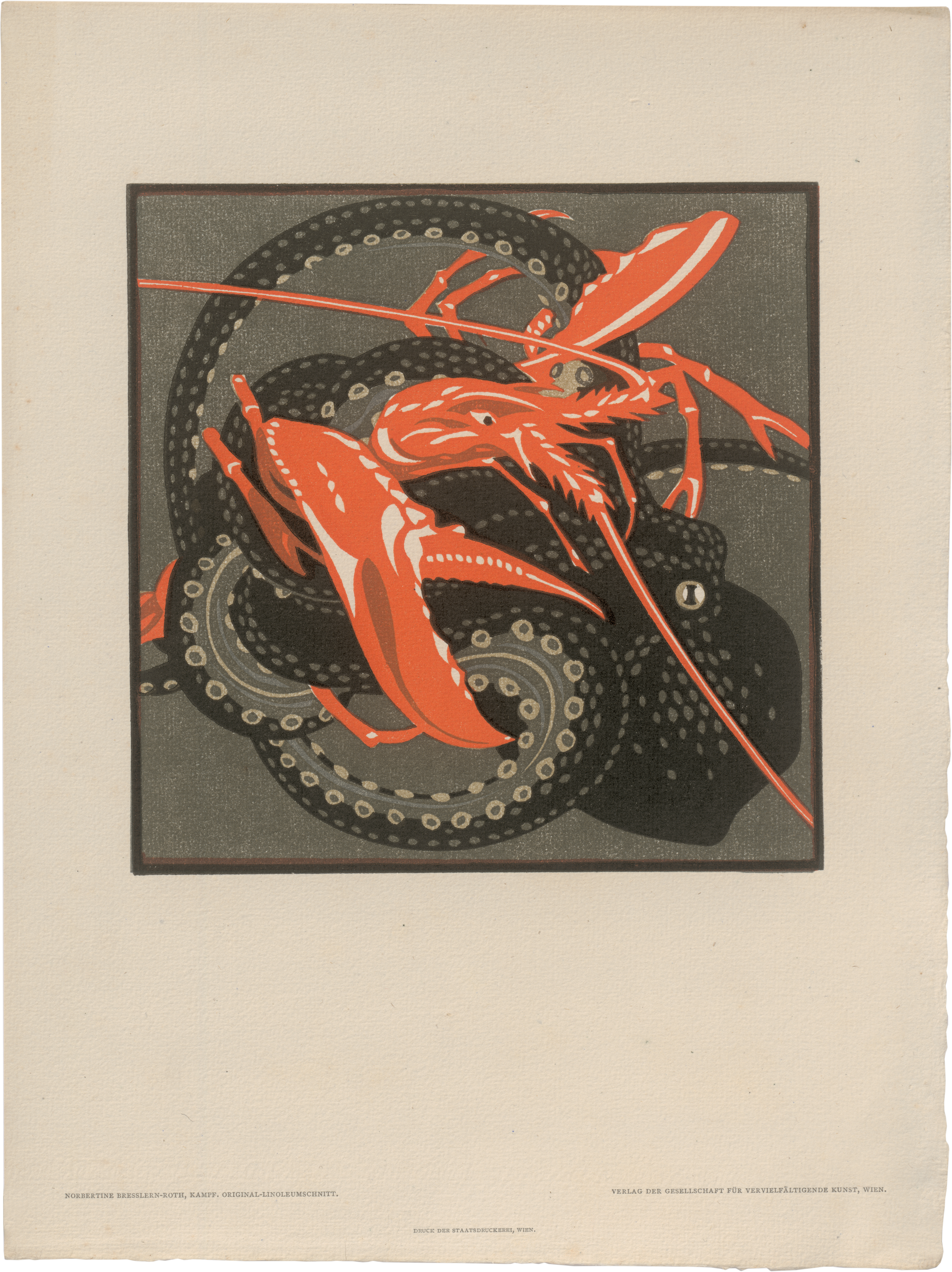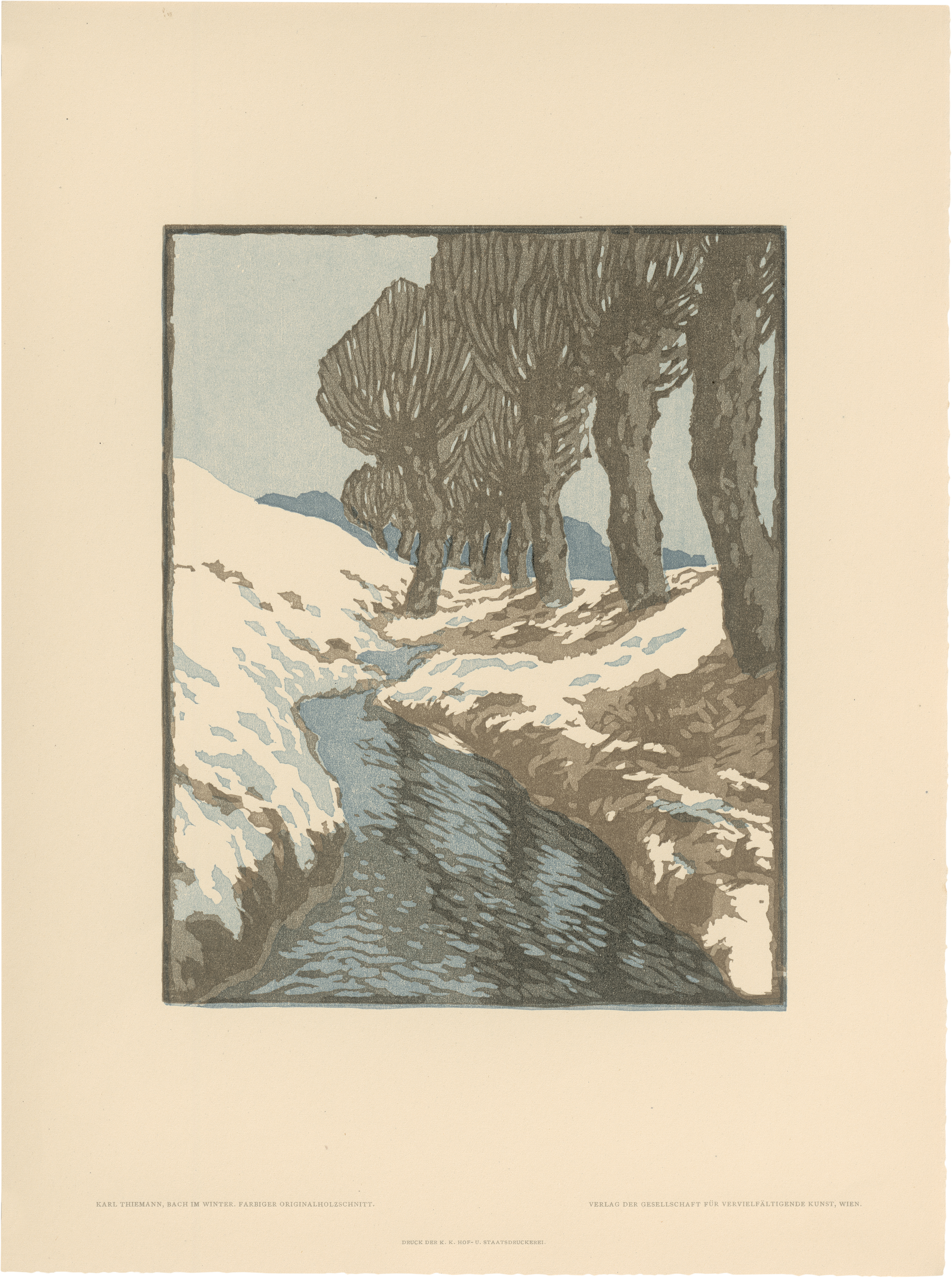 Mit Werken von 1) Gustav Bamberger. „Haus an der Brücke“. Lithographie; 2) Alfred Bentley. St.-Bénézet-Brücke in Avignon. Radierung; 3-5) 3x Emma Bormann. Am Bosporus. Linolschnitt. Petersbergl in München. Holzschnitt. Aus Holland (Godlinze). Holzschnitt; 6) Karl Alexander Brendel. Sommerabend. Holzschnitt; 7) Norbertine Bresslern-Roth. Kampf. Linoleumschnitt; 8) Fritz Burger. Damenporträt. Lithographie; 9) Paul Colin. „Sonntag auf der Marne“. Holzschnitt; 10) Walter Conz. „Schlosspark“. Lithographie; 11) Otto Fischer. „Am Meer“. Lithographie; 12) Otto Greiner. Fliehende Faune. Radierung; 13-14) 2x Alois Hänisch. „Feldweg“. Lithographie. Aus Schönbrunn. Lithographie; 15) Utagawa Hiroshige. "Fliegende Drachen“. Farbholzschnitt; 16-17) Ludwig von Hofmann. Reiter. Holzschnitt. Hirten. Holzschnitt; 18) Meinhard Jacoby. „Schauri (Ostafrika)" Lithographie; 19) Hede Jahn. Schloss Liechtenstein. Linoleumschnitt; 20) Ludwig Heinrich Jungnickel. Hirschkühe. Holzschnitt 21) Gustav Kampmann. "Ruine in Walde“. Lithographie; 22) Walter Klemm. „Junge Hunde“. Holzschnitt; 23) Ferdinand Kruis. „Prozession in Volendam“. Lithographie; 24) Oskar Laske. Evakuierte in Ostgalizien. Lithographie; 25) Emil Orlik. Porträtstudie. Lithographie; 26) Dagobert Peche. Phantasievogel. Linoleumschnitt; 27) Heine Rath. Eisblumen. Holzschnitt; 28) Marie Rollé. Arve am Gletscher. Holzschnitt; 29) Dante Gabriel Rossetti. „Gefunden“. Lichtdruck; 30) Karl Schwetz. Slowakisches Bauernhaus. Linoleumschnitt; 31) Ferdinand Steiniger. Fichte. Radierung; 32) Karl Sterrer. Schwestern. Lithographie; 33) Karl Thiemann. Bach im Winter. Holzschnitt; 34) Hans von Volkmann. Abend. Lithographie; 35) Wilhelm Woernle. Der Engel des Lebens. Radierung; 36-37) 2x Adolf Zdrasila, „Rübezahl“. Holzschnitt; „Kleiner See“. Holzschnitt. - Meist ganz ausgezeichnete Drucke mit breiten, meist wohl den vollen Rändern. Geringe Alters- und Gebrauchsspuren, sonst in sehr guter bis schöner Erhaltung.
