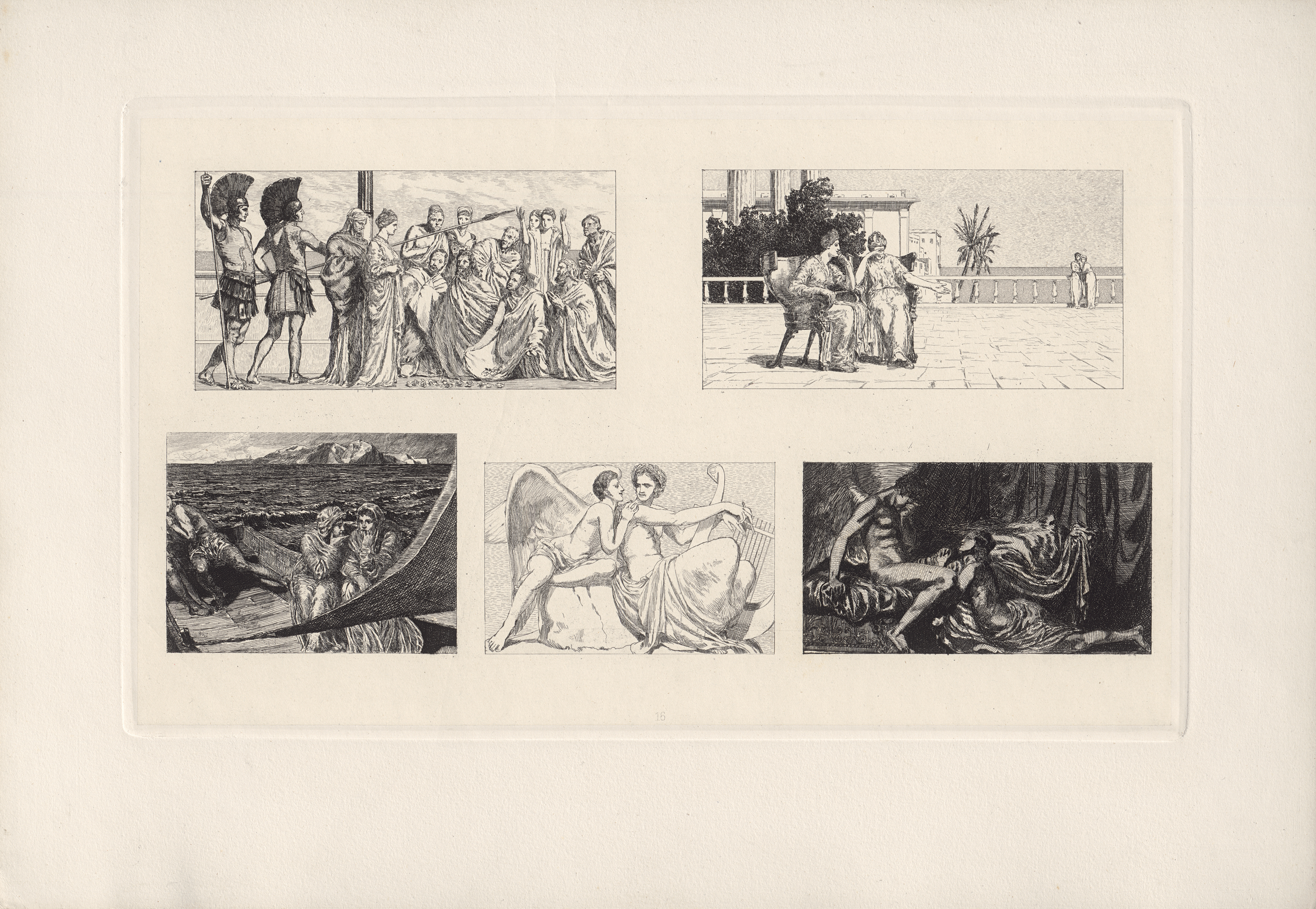 Amor und Psyche. Radierungen zu Apulejus' Märchen (Opus V b, Mappe II). 9 Radierungen mit 32 Vignetten, auf gewalztem China. 9,2 x 15,8 cm bis 20,4 x 31,2 cm. Lose in OHalbleinen-Mappe mit typographischem Titel und graphischer Bordüre (kaum merkliche Kratzer). (1880). Singer 65, 69, 80, 86 und 111, je I (von II); 74, 89, 94 und 98, je II (von IV); 72, 92, 95 und 99, je II (von III); 68, 88, 90, 106, je III (von IV); 79, 84, 87 und 101, je I (von II); 71, 78, 93, 103, je II (von III); 66, 76, 77 und 108, je I (von II); 70 und 109, je II (von III); 83.
