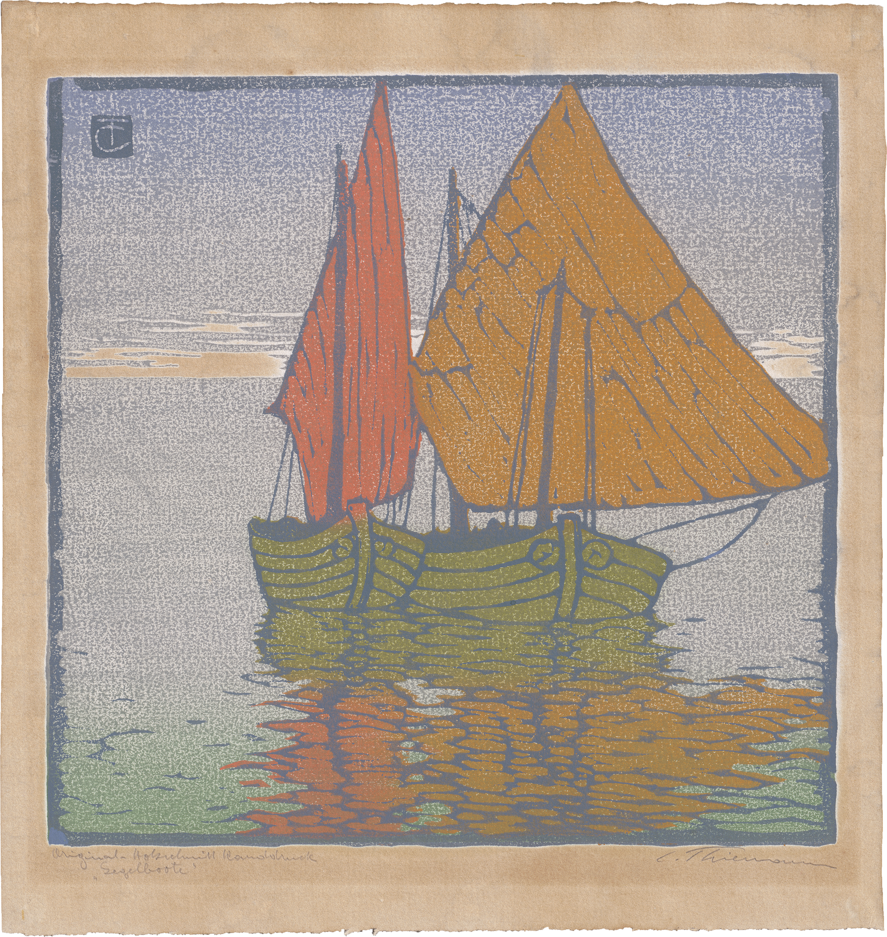 Segelboote. Farbholzschnitt auf feinem Bütten. 24,2 x 24,9 cm. Unterhalb der Darstellung signiert, eigenh. betitelt und als "Original-Holzschnitt Handdruck" bezeichnet. (1910). Merx 175 F.