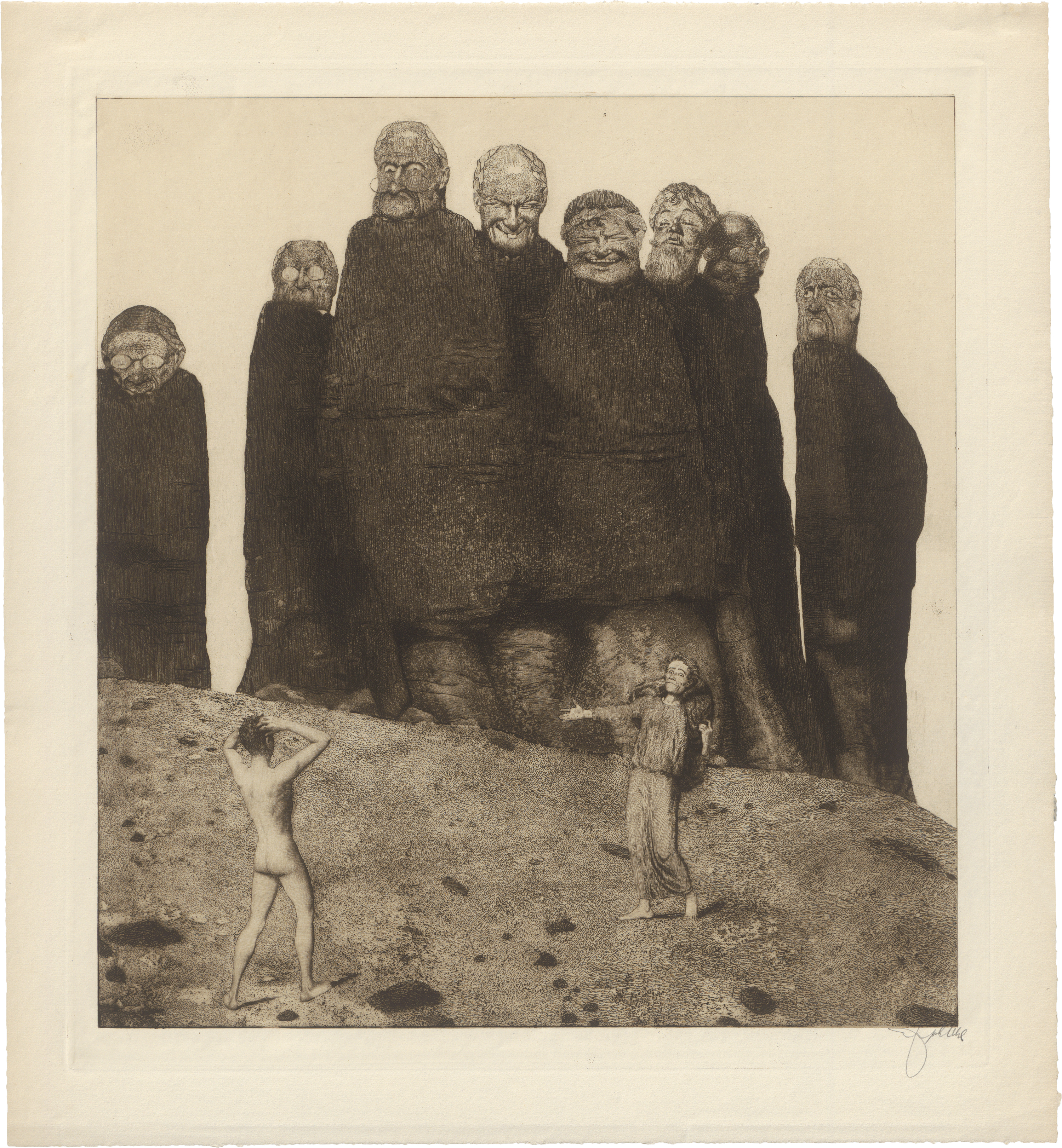 "Vorliegende neun Radierungen ... stellen den Versuch dar, die innere Entwicklung des zur Höhe strebenden Menschen in künstlerischer Form dazustellen. Vom ersten Erwachen des Ehrgeizes an durchlaufen die Blätter in großen Zügen die Bemühungen, Gefahren und Hemmungen, die erfahrungsgemäß die natürlichen Begleiter des Aufwärtsstrebenden sind" (Erläuterung). Die komplette Serie in prachtvollen, wirkungsreichen Drucken auf den vollen Bögen, in den originalen Passepartouts montiert. Mit Ausnahme punktueller Stockflecken in ganz vorzüglicher und originaler Erhaltung. Rarissimum.