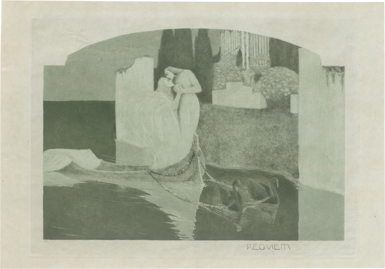 Requiem. Farbradierung in Grün, auf grün-grau gefärbtem Similijapan. 32,5 x 44,2 cm. Signiert vom Drucker "Otto Felsing". (1914).
