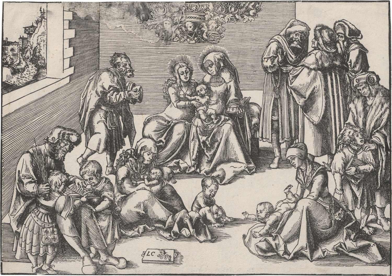 Mit dem Sprung unterhalb des Buches des Jungen rechts. Ausgezeichneter, gleichmäßiger Druck bis an die Einfassung beschnitten. Geglättete Mittelfalte verso, vereinzelt minimal stockfleckig, eine Fehlstelle am Oberrand teils im Wappen und links davon alt hinterlegt und in schwarzer Feder ergänzend retuschiert (partiell verrieben), sorgsame Retuschen im Sprung, sonst sehr gutes und insgesamt harmonisches Exemplar. Aus der Staatlichen Graphischen Sammlung München, mit deren Veräußerungsstempel (Lugt 1614 und 2481a) sowie mit einer älteren Bezeichnung in roter Feder "20ten Nov 1806".