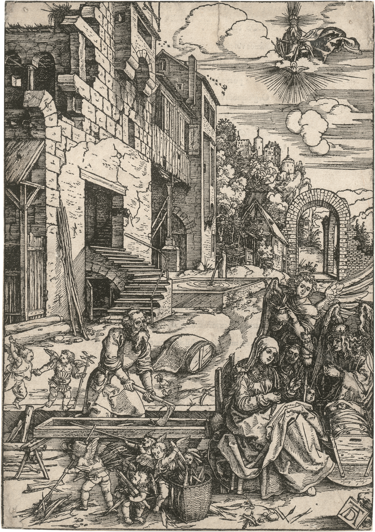 Aufenthalt in Ägypten. Holzschnitt aus dem Marienleben, wie auch die folgende Losnummer. 30,2 x 21,2 cm. Um 1504. B. 90, Meder 202, lateinische Textausgabe von 1511. Wz. Dreieck mit Blume (Meder 127).