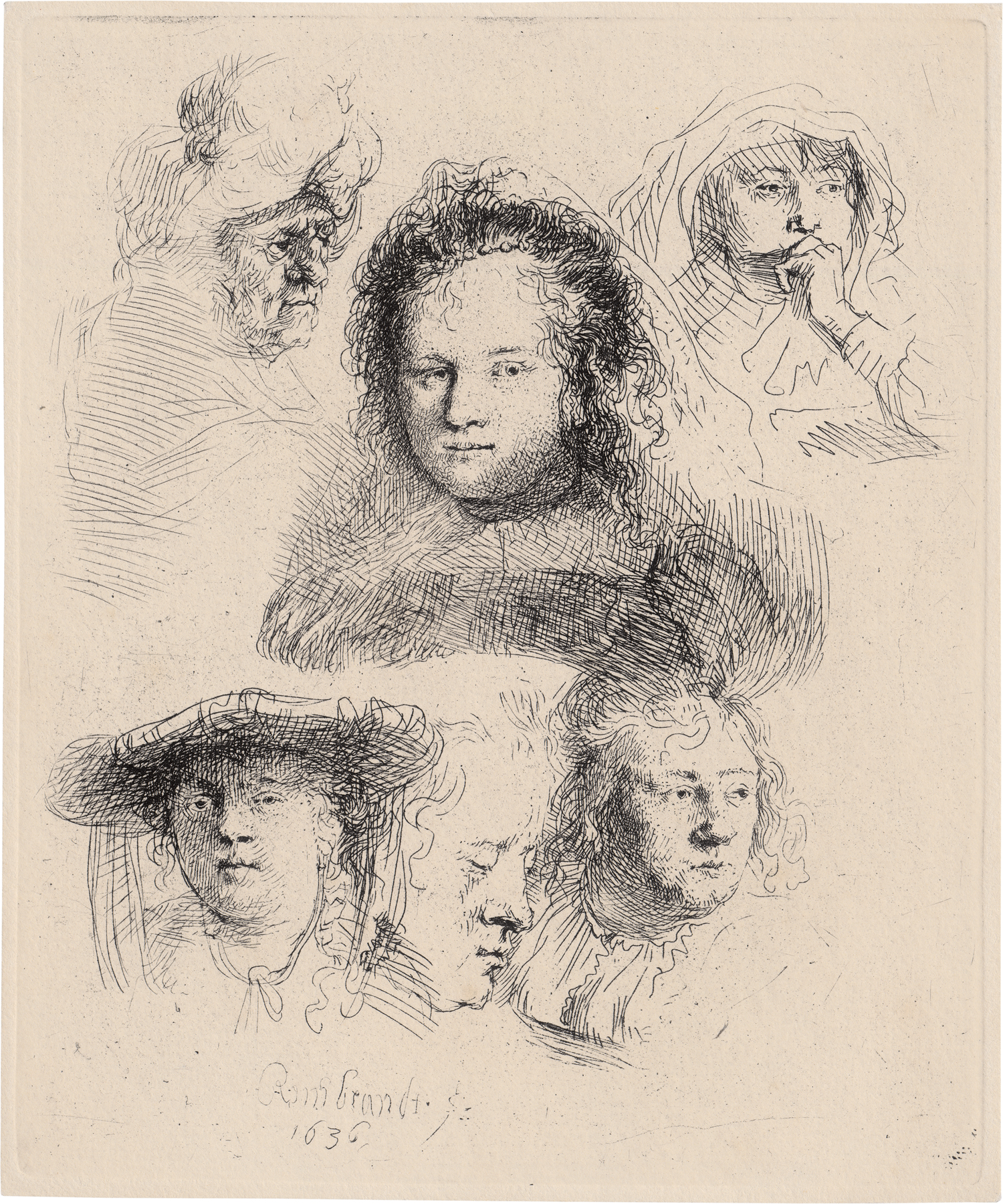 Studienblatt mit sechs Frauenköpfen. Radierung. 15,1 x 12,4 cm. 1636. B. 365, White/Boon (Hollstein) 365, Nowell-Usticke 365, Hinterding/Rutgers (New Hollstein) 157 II.