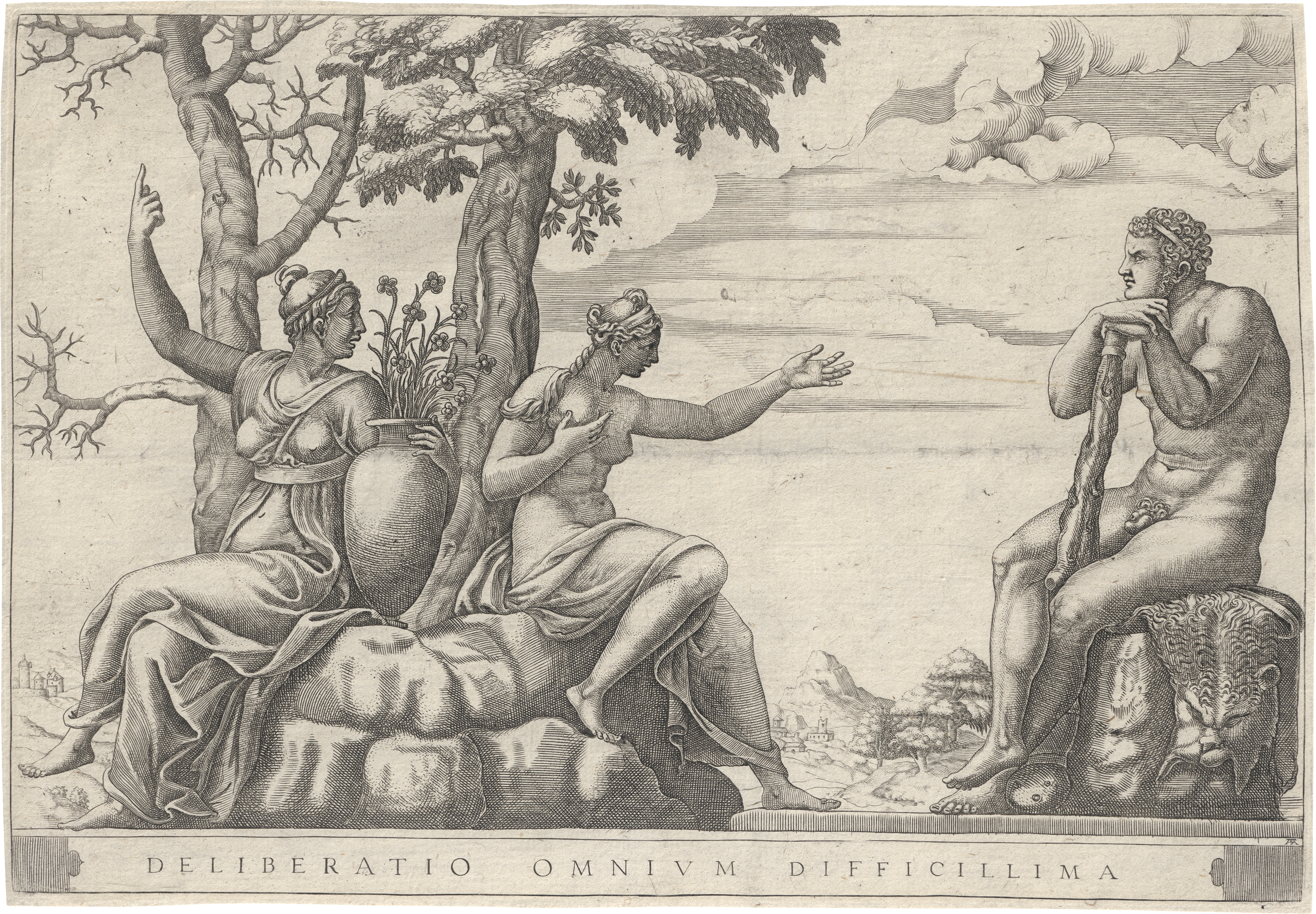 Herkules am Scheideweg. Kupferstich. 19,5 x 28,6 cm. B. XV, S. 425, 26, Bellini 20. Wz. Lilie.