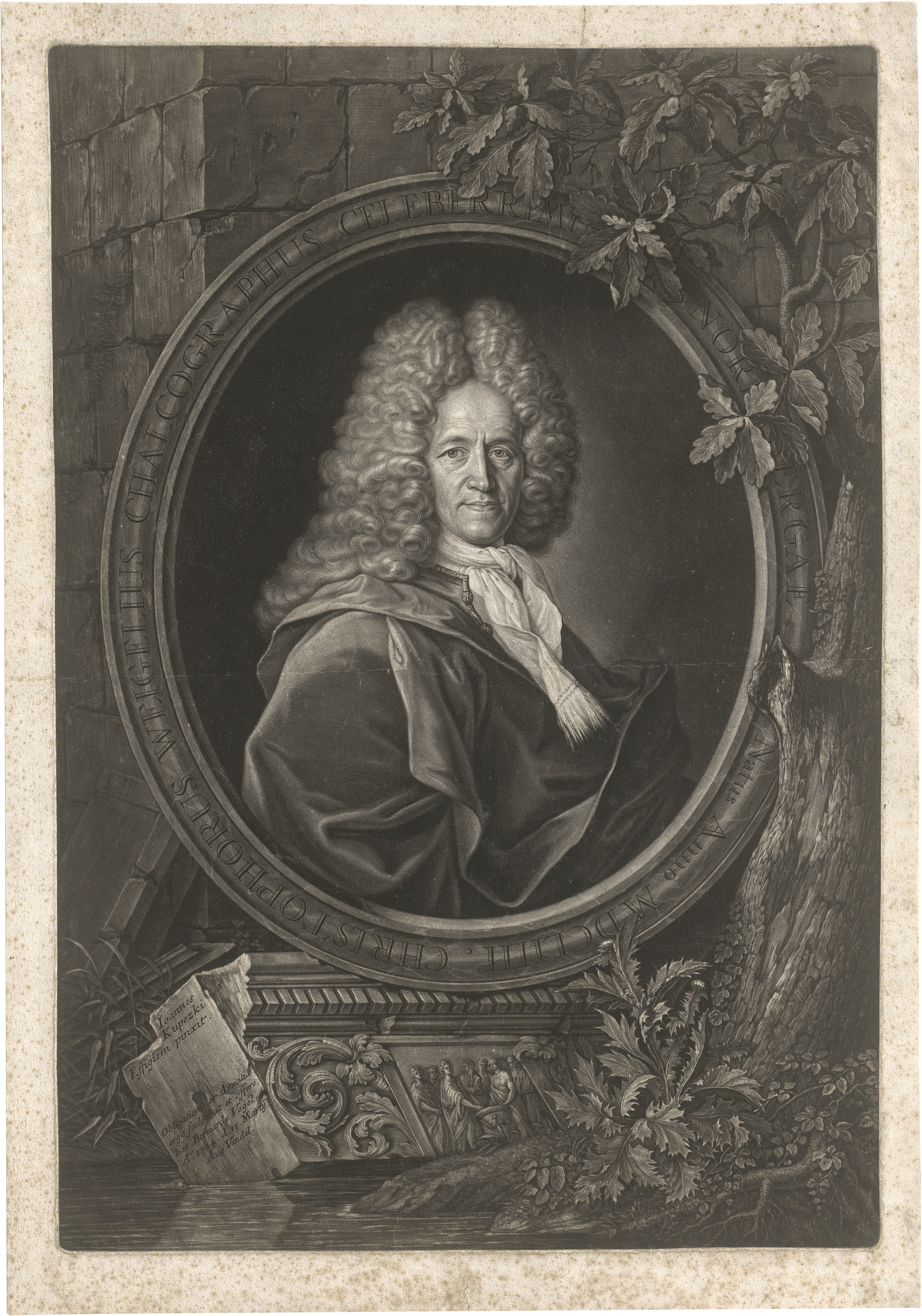 Bildnis des Kupferstechers Christoph Weigel. Schabkunstblatt nach Johann Kupetzky. 49,8 x 34,1 cm. (1714). Le Blanc 86.