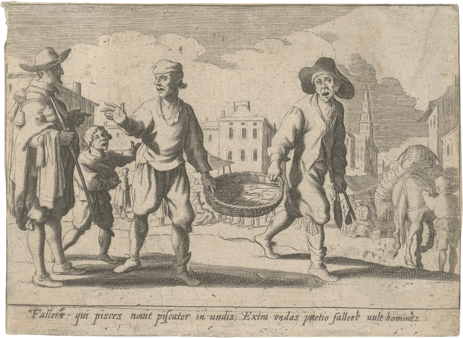 Die Fischverkäufer. Radierung. 9,1 x 12,4 cm. Hollstein 57 I (von II).