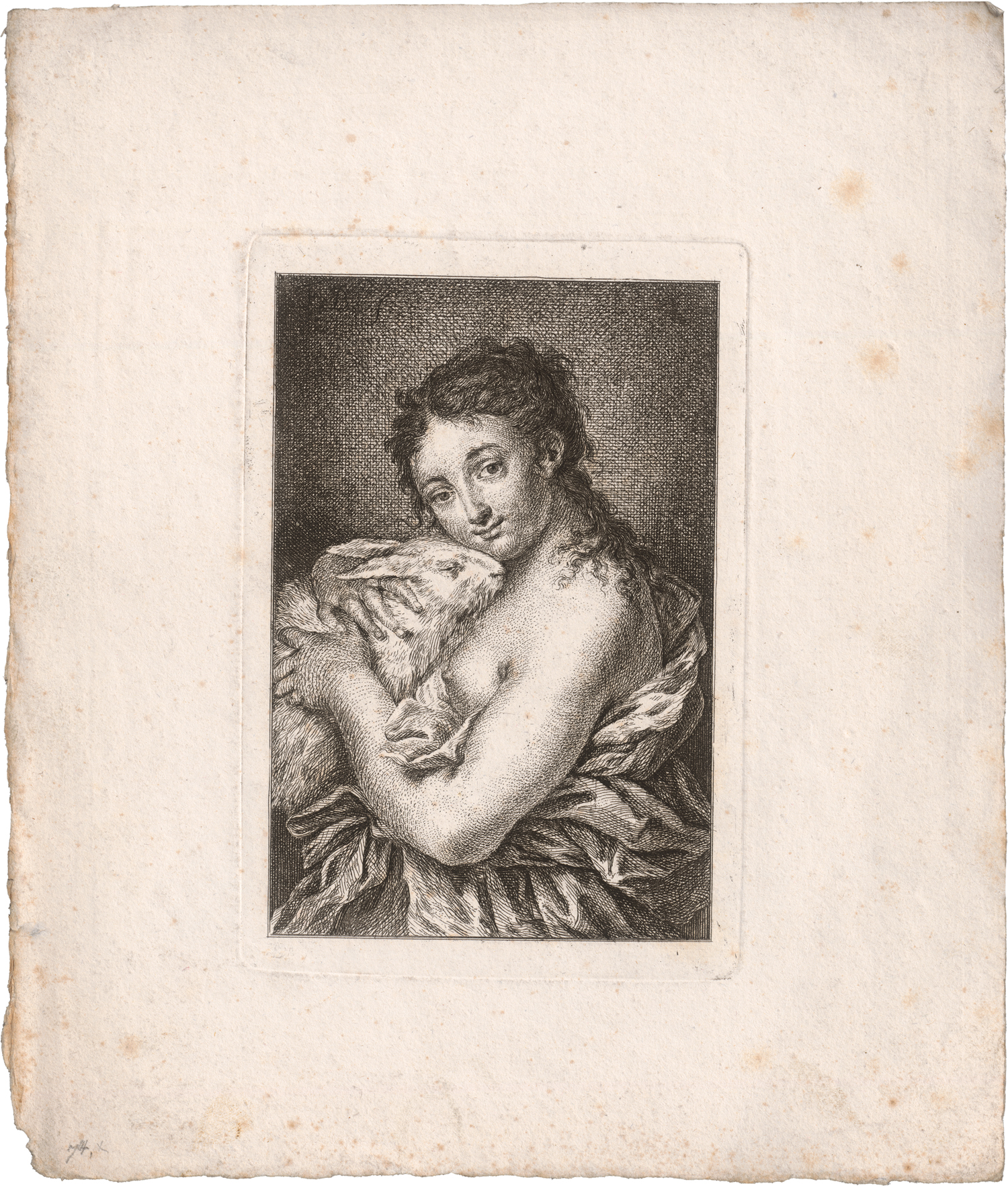 Halbe Figur einer Frau mit entblöster Brust und ein Kaninchen haltend. Radierung. 14,6 x 9,8 cm. Nagler 16.