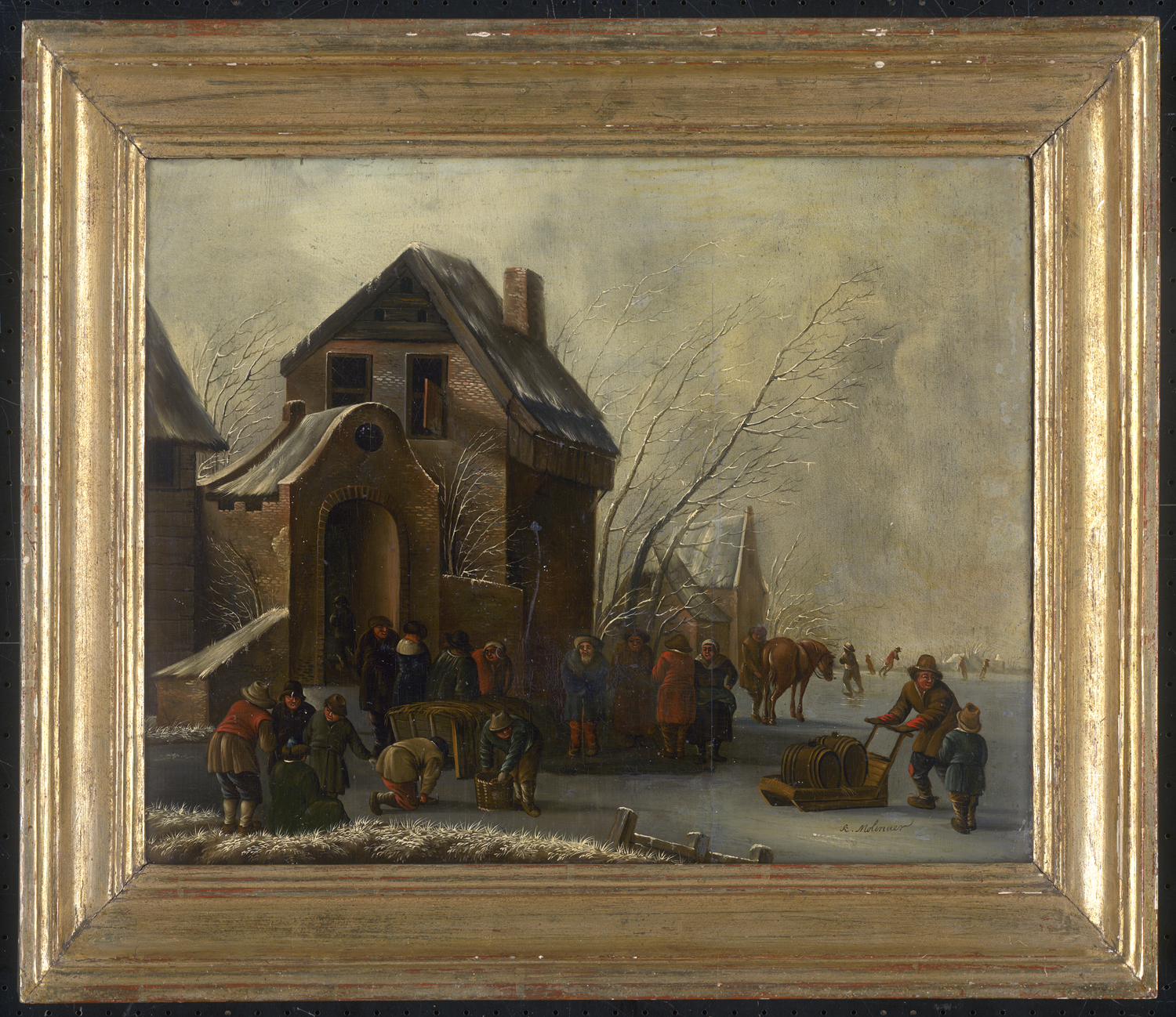 17. Jh. Winterliches Eisvergnügen vor einem Stadttor.