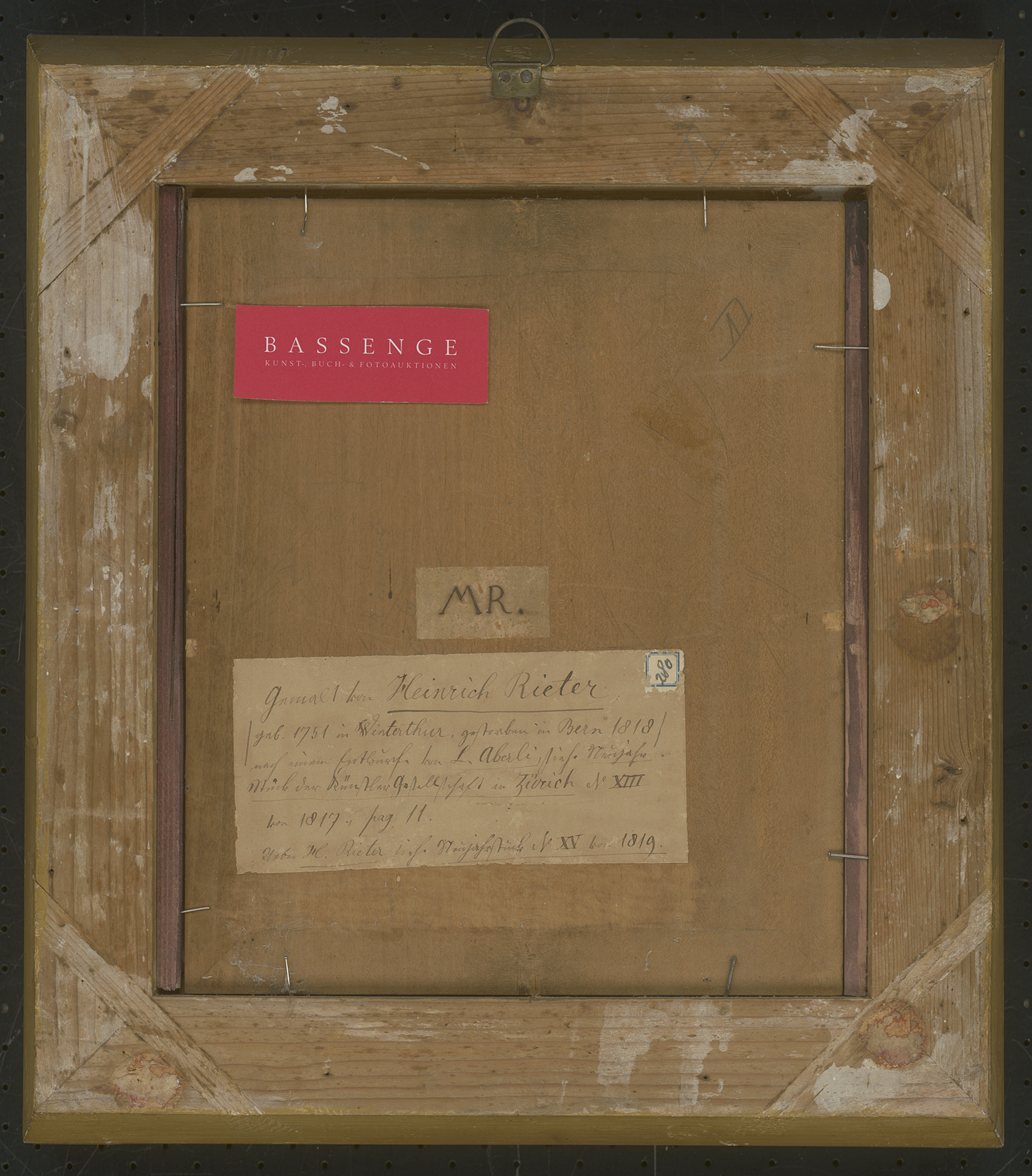Öl auf Holz. 28 x 23,5 cm. Verso mit altem Klebeetikett, dieses in einer Hand des 19. Jh. in brauner Feder bez. "Gemalt von Heinrich Rieter geb. 1751 in Winterthur, gestorben in Bern 1818 nach einem Entwurf von L. Aberli... Neujahrsstück der Künstlergesellschaft in Zürich No. XIII von 1817. pag. 11 ... H. Rieter... Neujahrstück No. XV von 1819", sowie einem weiteren Klebeetikett mit den Initialen "MR.".