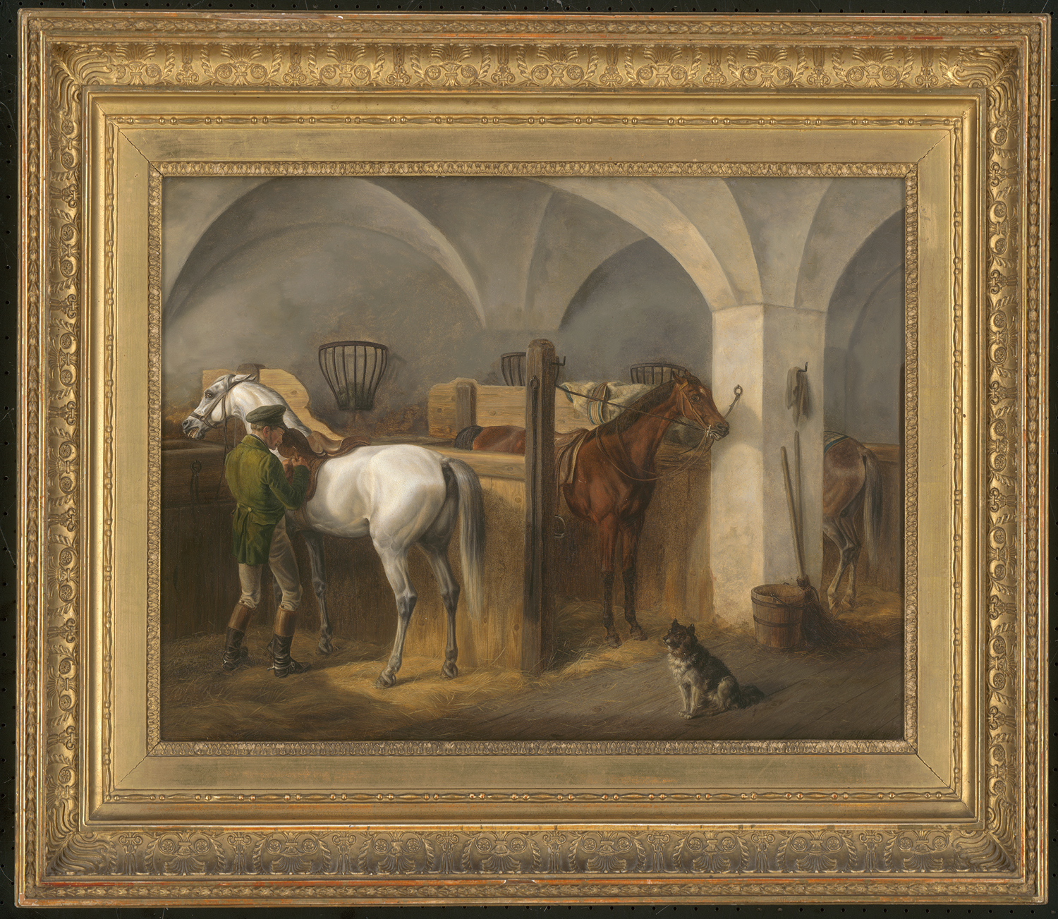 Albrecht Adam ist der Stammvater einer in vier Generationen tätigen bayerischen Künstlerfamilie. Berühmtheit erlangt er vor allem mit seinen vor Ort beobachteten Schlachtengemälden. Offizielle Auftraggeber waren unter anderen König Ludwig I. von Bayern, König Wilhelm von Württemberg und Kaiser Franz Joseph von Österreich. Neben den Schlachtengemälden spezialisiert sich Adam auf Bildnisse seiner adeligen Auftraggeber auf ihren Lieblingspferden und Portraits eben dieser Pferde. In München hat Adam sich seit 1824 auf seinem Anwesen, der sogenannten „Adamei“, ein ebenerdiges Atelier eingerichtet, in das die Pferde geführt werden konnten. Die exakte Wiedergabe der Anatomie, die die Vorzüge der jeweiligen Rasse herausstellte, steht im Mittelpunkt dieser Pferdebildnisse, mit denen Adam zum bedeutendsten Pferdemaler seiner Zeit aufsteigt. Im Jahr der Entstehung unseres Gemäldes 1827 beginnt er, mit Hilfe seiner Söhne, zudem mit der Veröffentlichung des auf über 100 Tafeln angelegten lithografischen Prachtwerkes Voyage pittoresque et militaire de Willenberg en Prusse jusqu'à Moscou fait en 1812, welches Adam als am Feldzug teilnehmender Attaché des Prinz Eugène in umfangreichen Zeichnungen direkt vor Ort in zahlreichen Skizzen vorbereitet hatte.