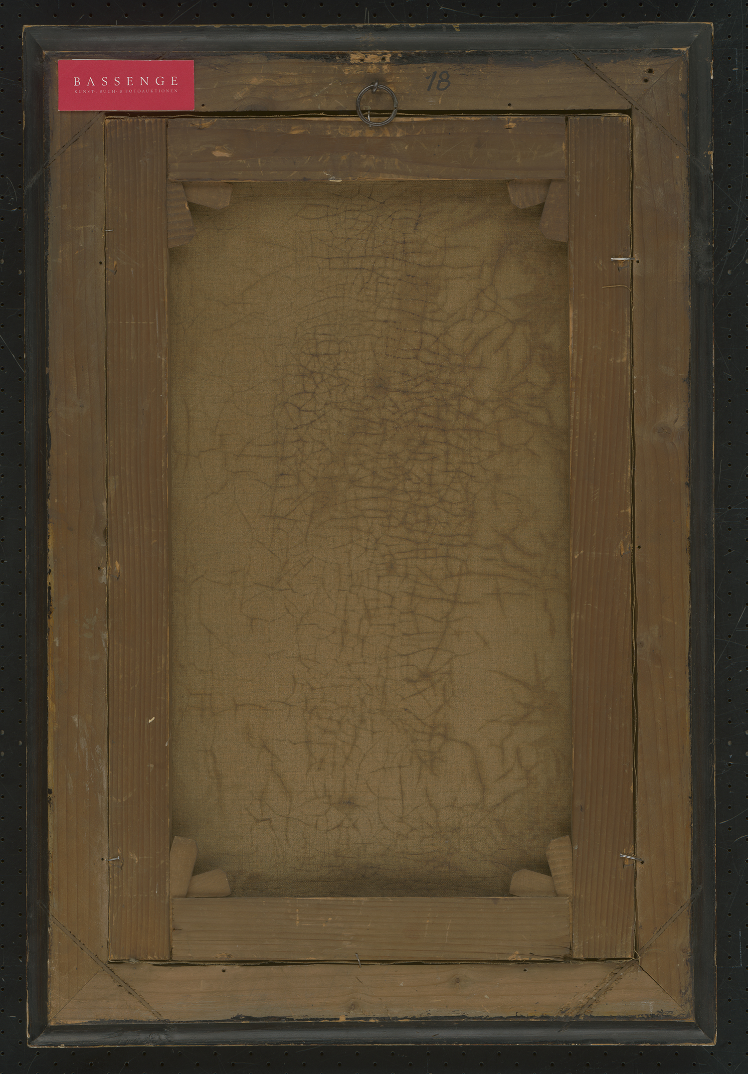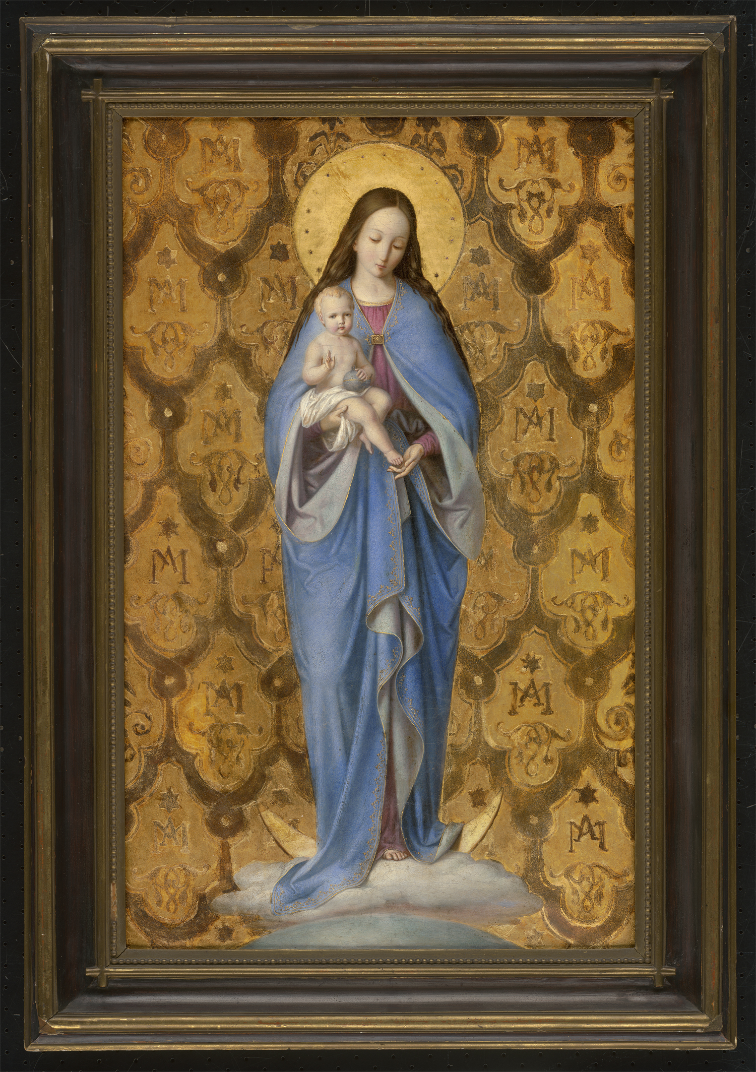 Öl und Goldhöhungen auf Leinwand, reliefierter Goldgrund mit ligiertem Marienmonogramm. 55,2 x 34,6 cm.