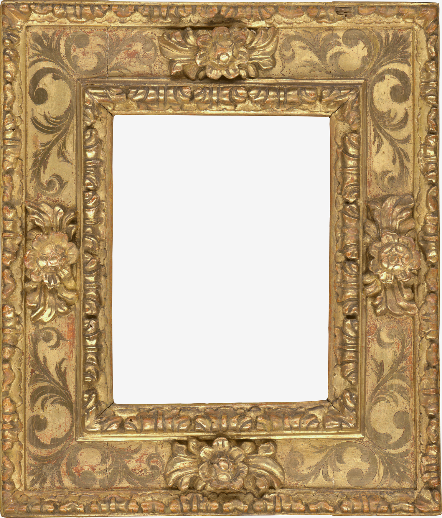 geschnitzt und vergoldet, Sichtleiste Rundstab, ansteigendes Profil mit Blattornamenten, abfallende Kehle, gravierte Platte mit aufgesetzten Blumenelementen je in der Mitte, aufsteigendes Profil mit Blattornamenten als Abschluss.