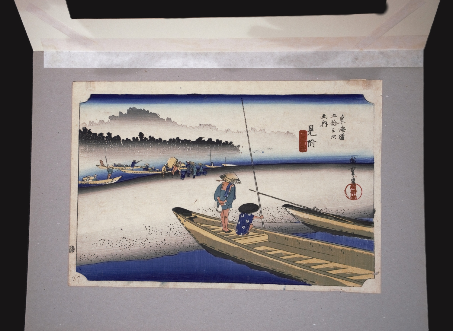 Hiroshige, Ando Ichiryusai. Ansicht von Mitsuke. Ukiyo-e Farbholzschnitt aus der Serie Gojûsan-tsugi meisho zue (japonice: Ansichten der 53 Stationen des Tôkaidô). Format ôban yoko-e. 25 x 37 cm. Unter Karton-Passepartout. Tokio, Hôeidô, um 1850.