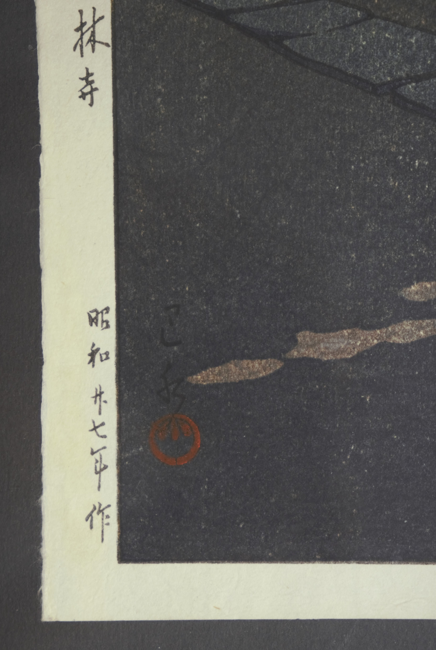 Kawase, Hasui. Der Heirin-ji Temple - Nobidome. Farbholzschnitt. Format ôban tate-e. 40 x 26,5 cm. Unter Glas in schwarz-golden lackierter Holzprofilleiste. Edo (Tokio), Watanabe Shozaburo, ca. 1952.