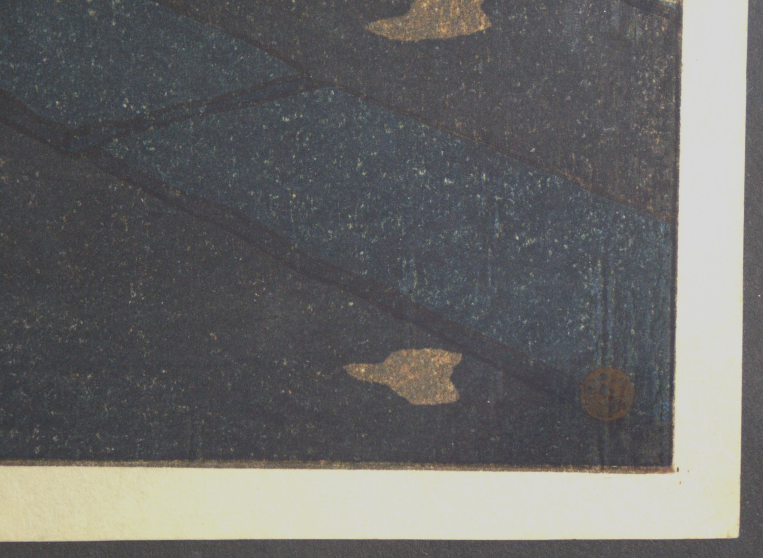Berühmtes Motiv des japanischen Holzschnittmeisters Hasui Kawase (1883-1957). Er zählt zu den wichtigsten japanischen Landschaftskünstlern des 20. Jahrhunderts. Seine Arbeiten zeichnen sich durch die charakteristischen Lichtspiele, geschickten Kompositionen und eindringliche Stimmungen aus, die den Holzschnitten eine besondere Plastizität verleihen. Unter dem Einfluss westlicher Stilmittel trug Kawase maßgeblich zur Erneuerung des Ukiyo-e in der Moderne bei. Beim Großen Kantô-Erdbeben 1923 verlor er fast sein gesamtes Frühwerk, darunter über 200 Skizzen. – In sehr gutem Zustand (nicht ausgerahmt) und in besonders intensiv-gesättigter Farbigkeit. Versand erfolgt nur ohne Rahmen.