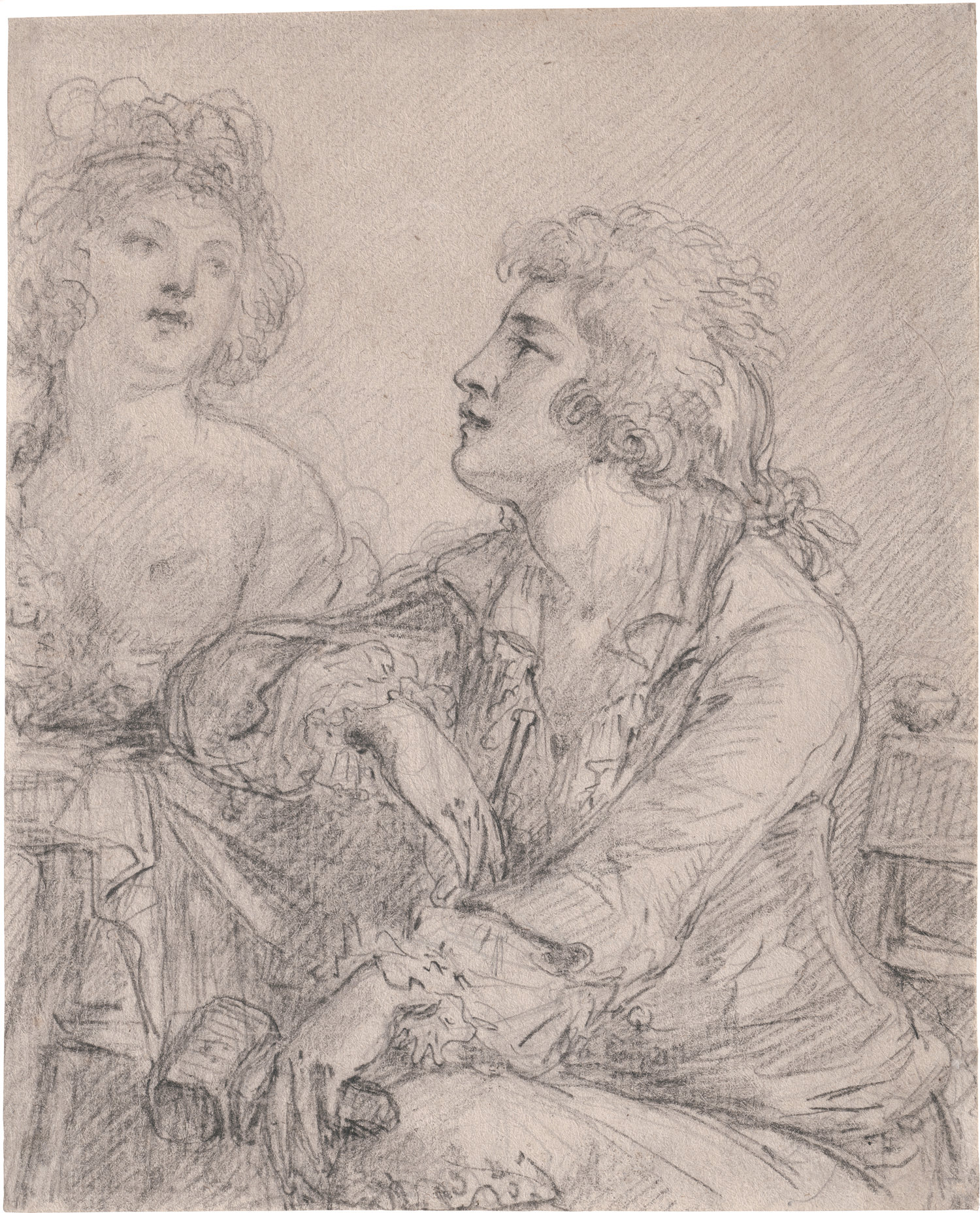 Der Kupferstecher und Zeichner Augustin de Saint-Aubin wurde zuerst von seinen beiden älteren Brüdern angeleitet und lernte anschließend bei Étienne Fessard und Laurent Cars. Im Jahre 1771 wurde er Agrée der Akademie und erhielt nach Fessards Tod den Ehrentitel Graveur de la bibliothèque du Roi. Saint-Aubin schuf ein umfangreiches druckgraphisches Œuvre und tat sich auch als Illustrator hervor. Saint-Aubin zählt zu den versiertesten französischen Bildnisstechern des 18. Jahrhunderts. Unsere Zeichnung diente als Vorlage für einen Stich Jean-Baptiste Gautiers (tätig ca. 1780-1820 in Paris) mit dem Titel "L'hommage reciproque" (Inventaire du Fonds Français 2, Bocher 411). Zusammen mit einem Pendant stellte es die Bildhauerei im Gegensatz zur Malerei dar. Das auf die Pygmalion-Legende anspielende Blatt zeigt einen Bildhauer mit Werkzeugen in den Händen, den rechten Arm gestützt auf einen Bildhauerbock, der eine weibliche Büste trägt. Der Blick des jungen Mannes hängt verträumt an der Marmorskulptur. Wie in Ovids Metamorphosen berichtet, verliebte sich der griechische Bildhauer Pygmalion in eine von ihm selbst geschaffene Skulptur und zeugte mit ihr, nachdem Venus seinen Wunsch erhört und sie zum Leben erweckt hatte, die Tochter Paphos.