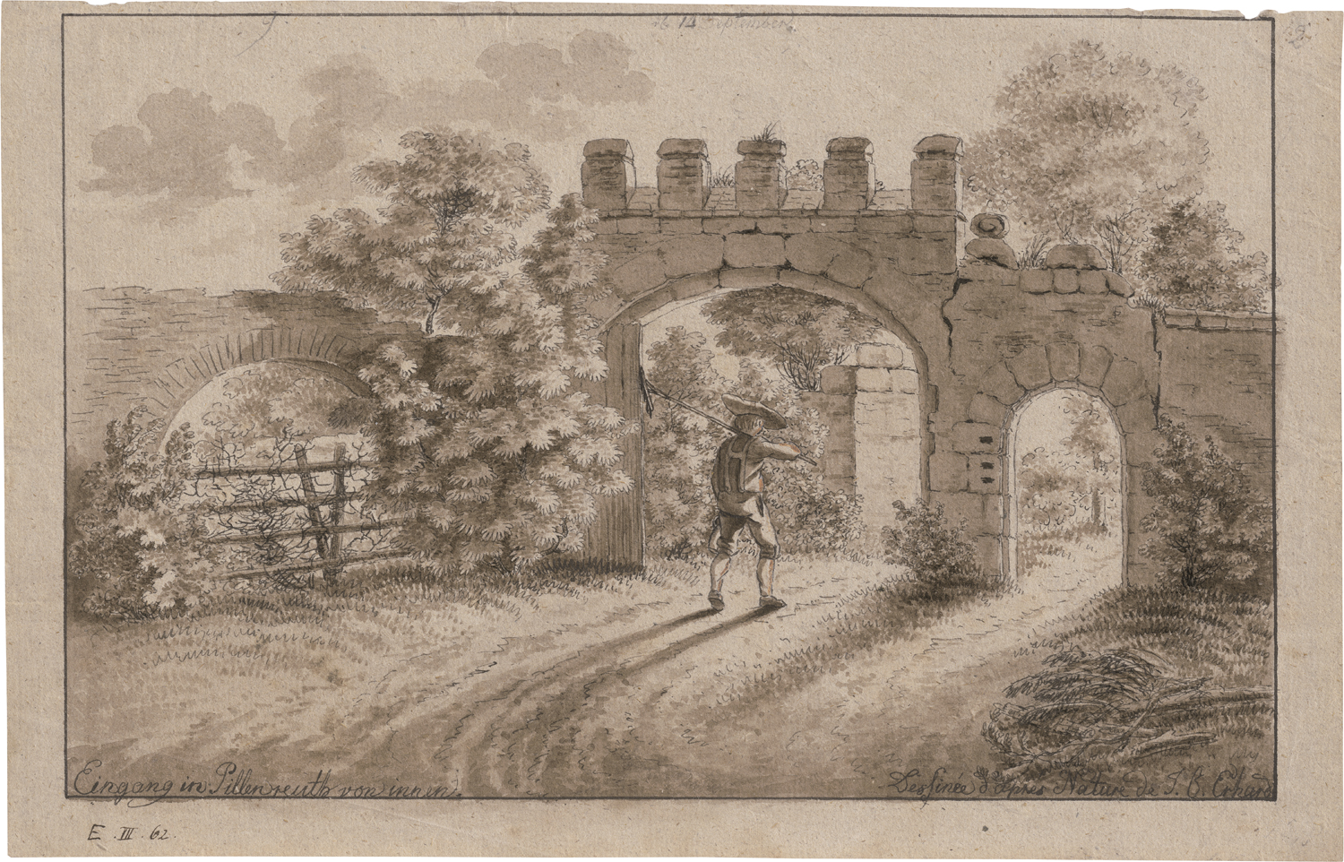 Feder in Schwarz, Pinsel in Braun, Spuren von Rötel auf der Staffagefigur, mit Einfassungslinie in schwarzer Feder. 17,8 x 27,8 cm. Unten links bezeichnet "Eingang in Pillenreuth von innen.", unten rechts signiert "Dessinée d apres Nature de J. C. Erhard", oben mittig mit Bleistift datiert "d 14 September", unten links außerhalb der Darstellung nummeriert "E. III. 62".