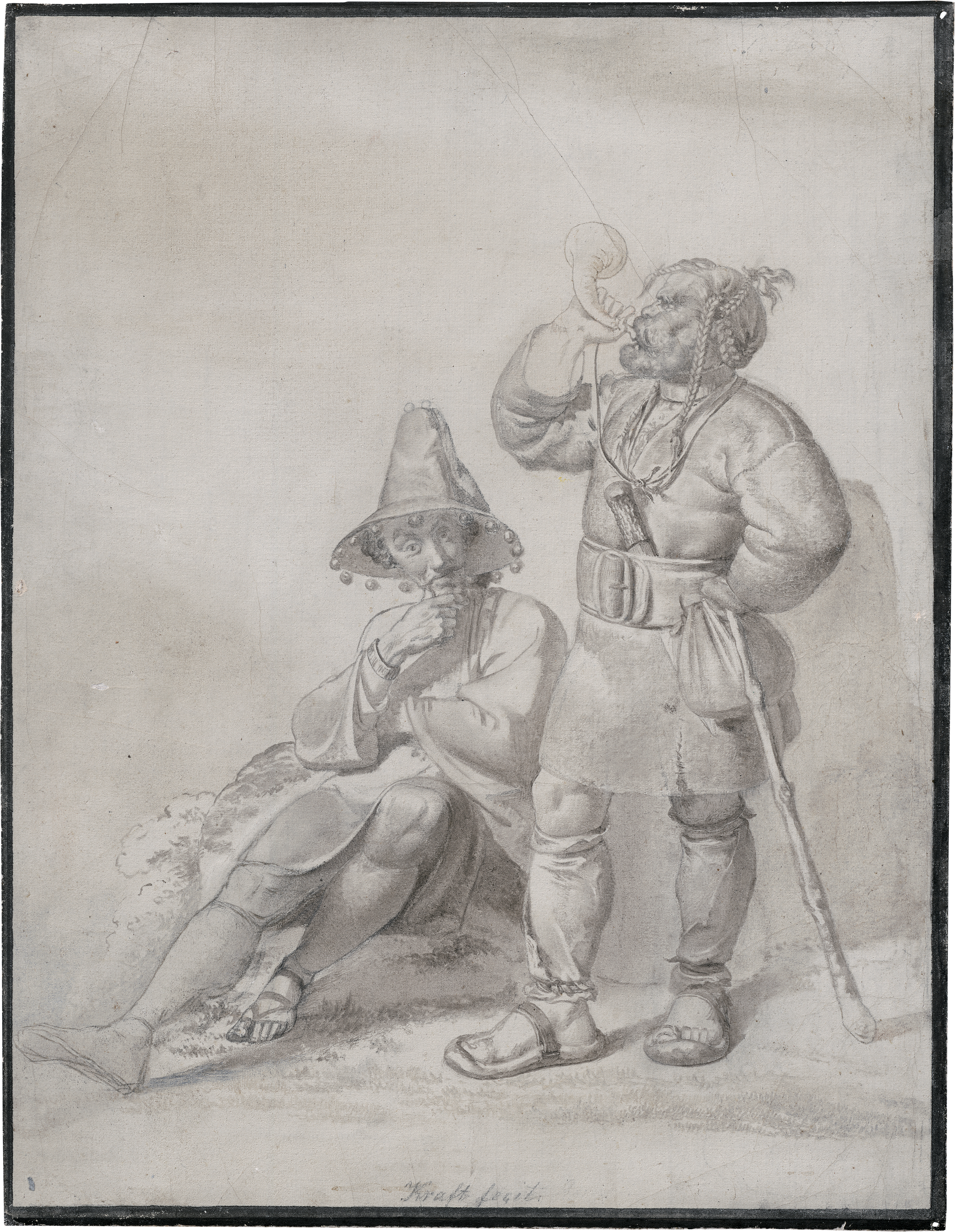 Bleistift, Pinsel in Graubraun, auf hellgrau grundiertem Papier, auf fester Pappe kaschiert. 27 x 20,8 cm. Unten mittig signiert "Kraft fecit", verso auf dem Untersatz (eigenh. ?) in dänischer Sprache bezeichnet "Swinehyrten Gurth og Narren Wamba efter Walter Scotts Roman Ivanhoe / August Krafft fec.".