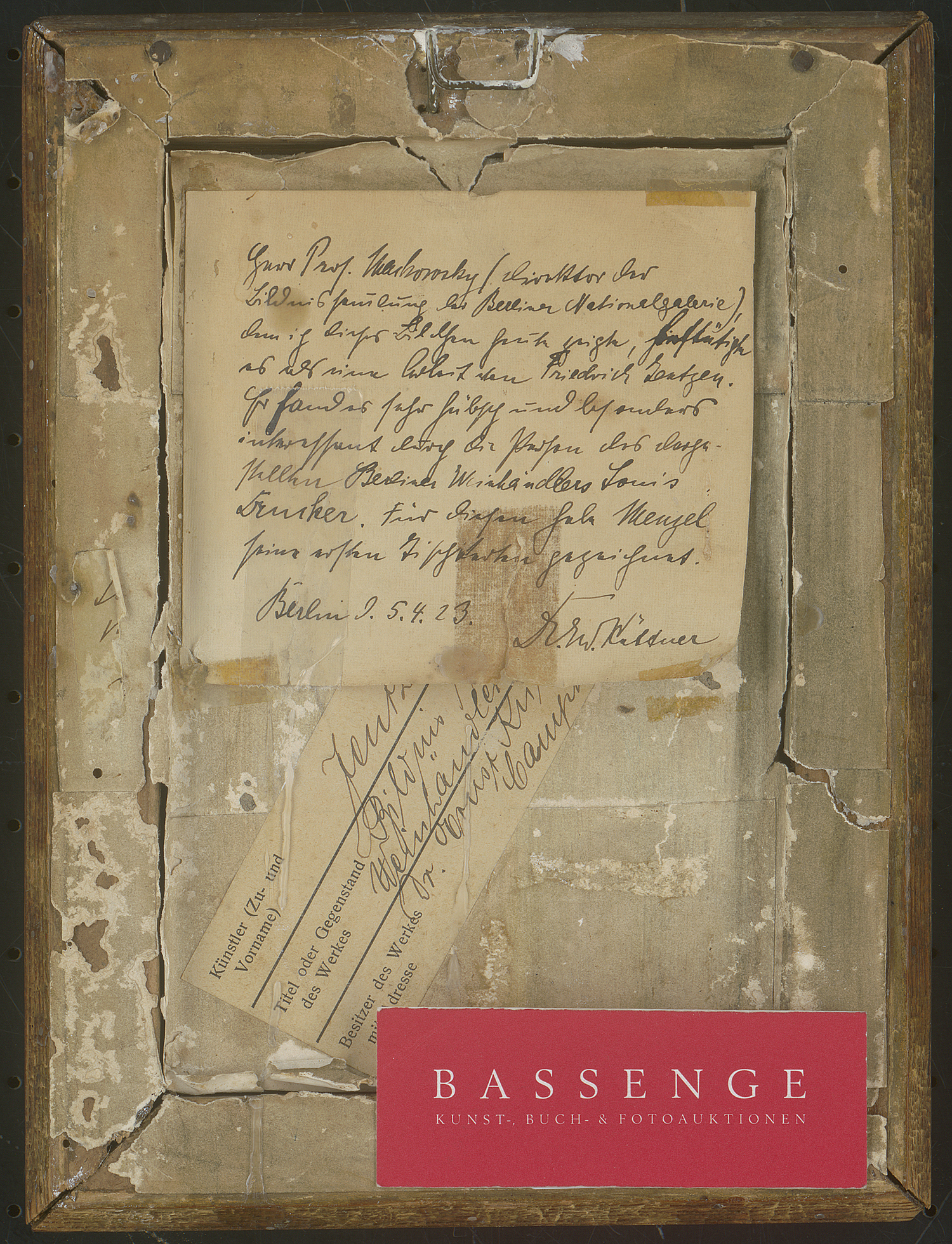 Öl auf Leinwand, auf Karton kaschiert. 15 x 9,5 cm. Verso auf dem Rückdeckel in Bleistift von alter Hand bez. "Louis Drucker von Jentzen gemalt", ferner mit montiertem Zettel mit handschriftl. Annotation von Dr. Ernst Küttner und einem weiteren Etikett mit Angaben zu dem Werk.