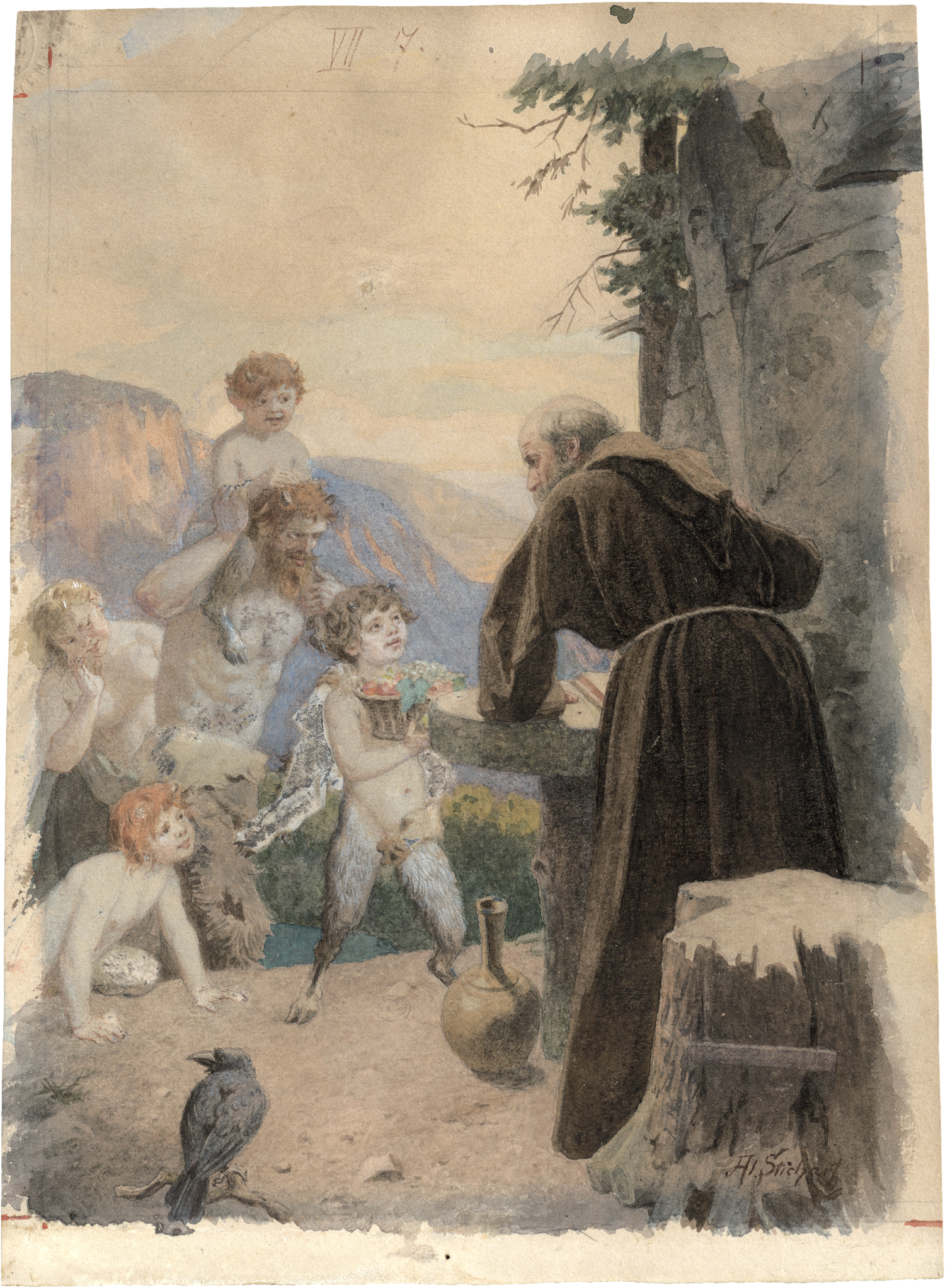In sieben Blättern illustriert Stichart die Geschichte eines Einsiedlers, der sich eines verwaisten Satyrknaben annimmt, ihn aufzieht, unterrichtet und anschließend wieder verstößt, als sich der herangewachsene Satyr in eine Satyrdame verliebt. Im letzten Bild der Folge kehrt der Satyr nun mit seiner Familie zurück und dankt dem Einsiedler mit Geschenken. Offenbar waren die Blätter Vorzeichnungen für Graphiken. Das Kupferstichkabinett Dresden besitzt eine Gouache mit der Darstellung, bei der der Mönch dem Knaben das Beten lehren möchte. Dieses Motiv erschien auch als Graphik bei den Sächsischen Kunstvereinsblättern mit dem Titel "Frommer Wunsch".