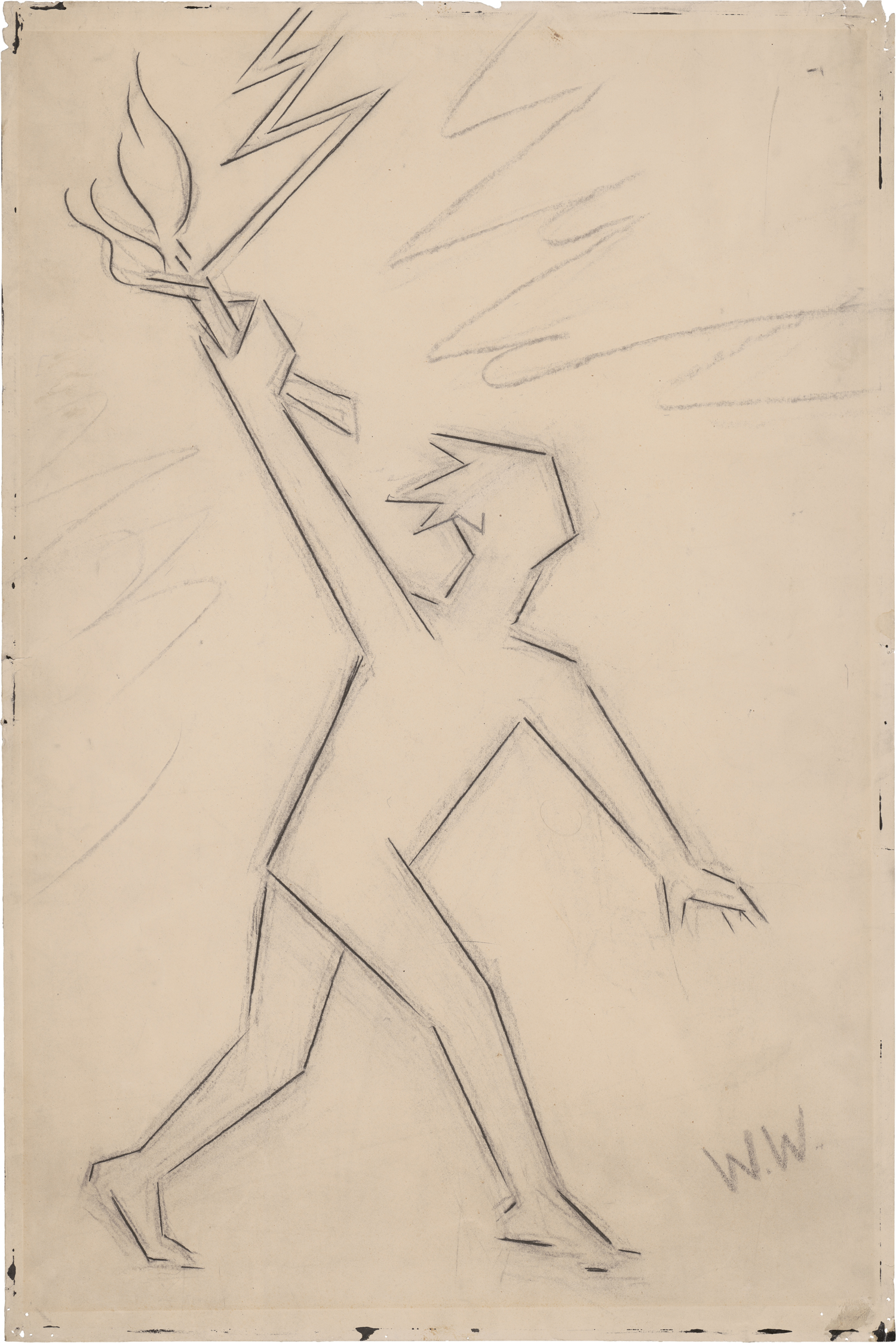 Dynamik, Führung, Inspiration - Wauers großformatige Zeichnung bringt in seiner Figur des Fackelträgers Bedeutungsinhalt und Zeichenstil in Einklang. Ausschließlich mit Geraden konstruiert er die vorwärtsstürmende Gestalt und beschränkt sich auf die bloßen, hart abstrahierten und geometrisierten Konturen, verzichtet also auf jegliche Binnengestaltung. Wenige lockere Bleistiftschwünge deuten sowohl die expressive Bewegtheit der Szene als auch den nicht näher bestimmten Umraum an.