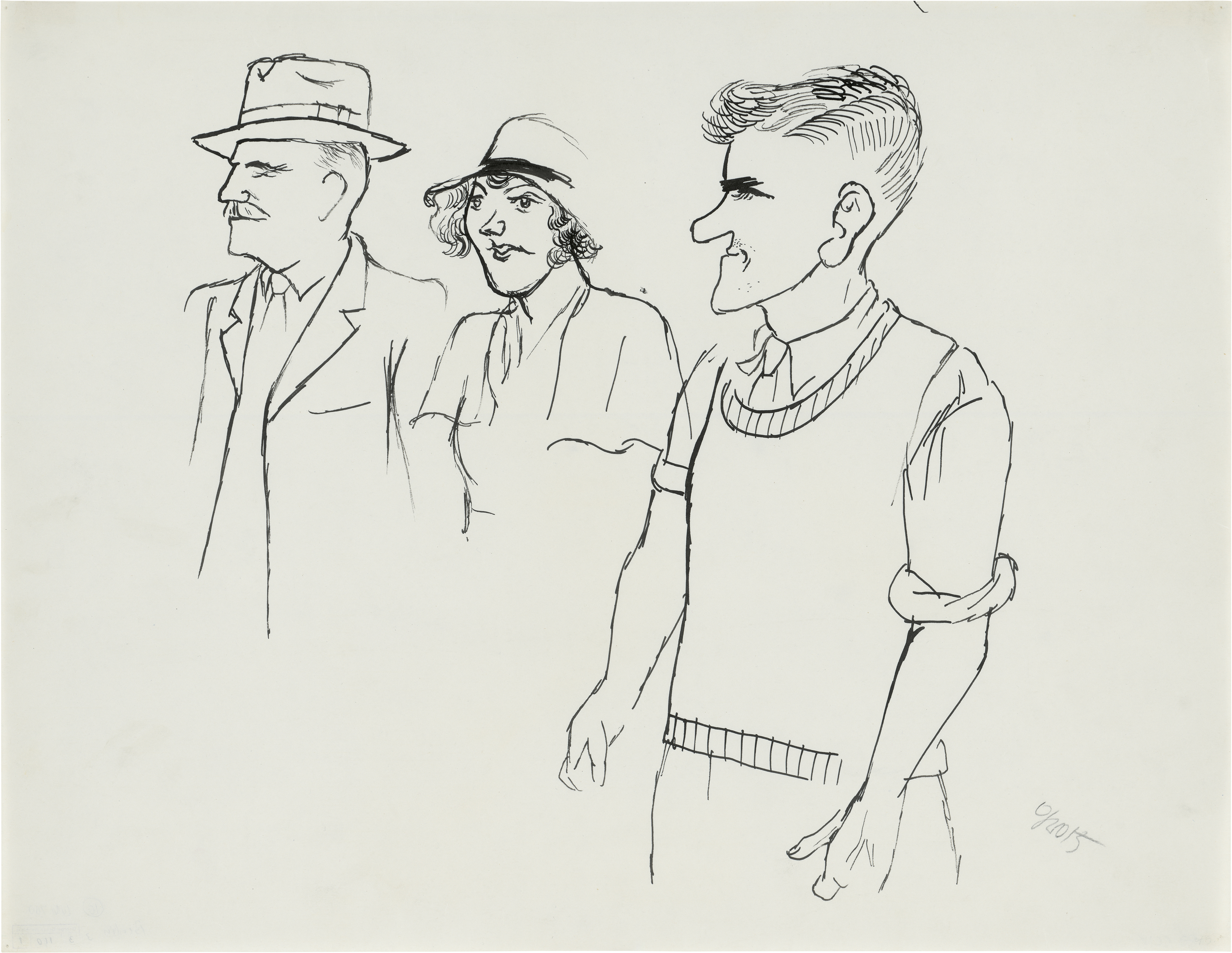 Er ist einer der scharfsinnigsten Beobachter der sozialen Wirklichkeit in der Weimarer Republik. Mit gewohnt sicherem Federstrich skizziert George Grosz in der hier vorliegenden Zeichnung drei zeittypische Figuren der 1920er Jahre und platziert sie kaum zufällig, sondern wohlkomponiert auf dem Papier. Berliner Straßenszenen zählen zu einem der wichtigsten Werkkomplexe in seinem gesamten Œuvre und entstanden hauptsächlich in den Jahren 1925 bis 1932. Dabei nimmt Grosz die gesamte Bandbreite der unterschiedlichsten Großstadttypen ins Visier, wie er sie vor allem an der belebten Friedrichstraße, auf dem Kurfürstendamm und der Tauentzienstraße findet. Liebespaare, willkürliche Passanten oder zufällige Begegnungen von Jung und Alt, aber auch Militärs, Geistliche oder Richter - alle stets treffend charakterisiert und oft als Gegensatzpaar miteinander im Kontrast stehend. Wir danken Ralph Jentsch, Berlin, für freundliche Hinweise. Die Arbeit wird in das in Vorbereitung befindliche Werkverzeichnis der Arbeiten auf Papier aufgenommen.