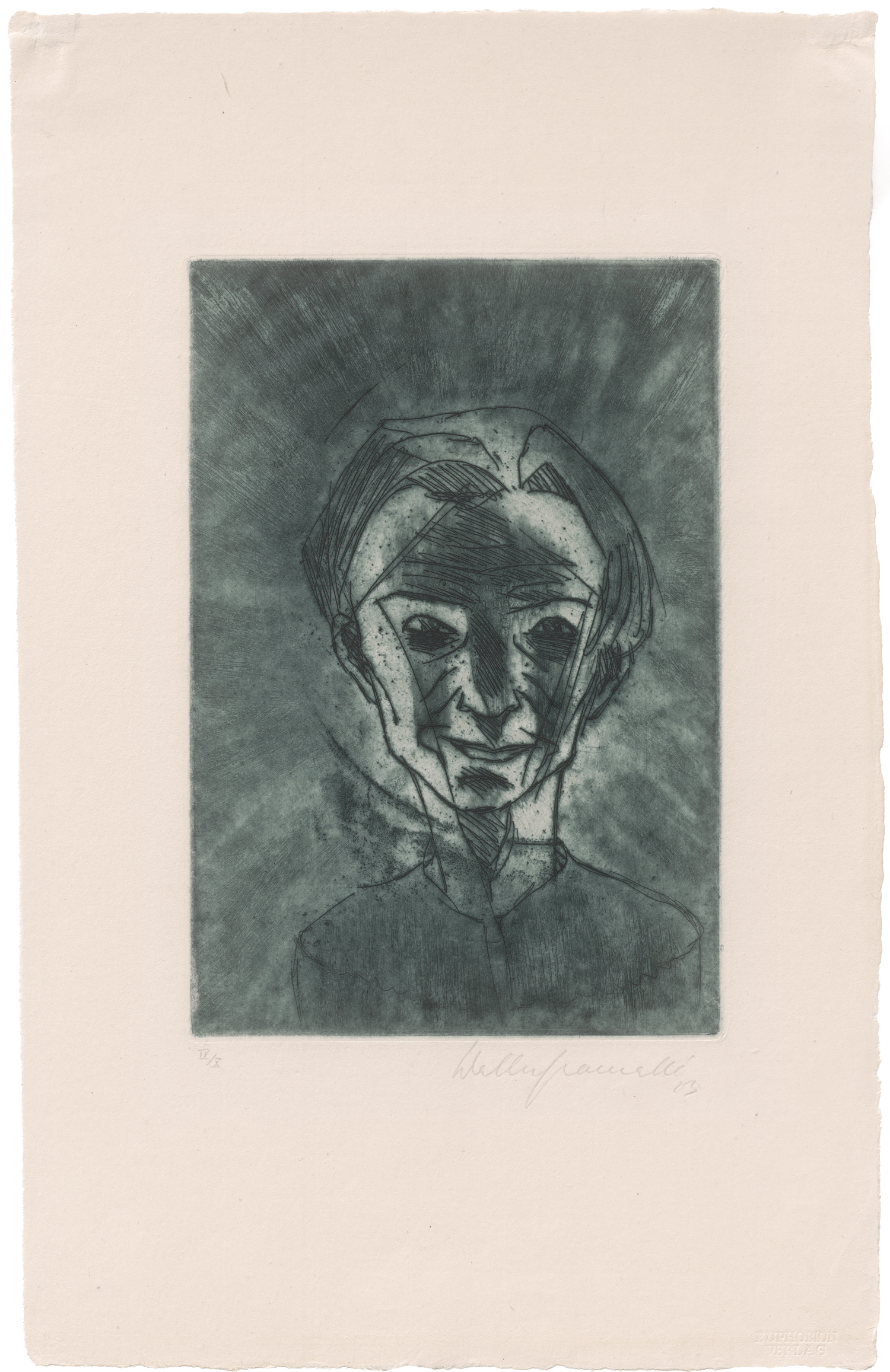 Blatt II aus dem Mappenwerk "Das Gesicht, neun Radierungen", erschienen in einer Gesamtauflage von 75 numerierten Exemplaren im Euphorion Verlag, Berlin, mit dessen Trockenstempel in der rechten unteren Blattecke. "Es ist immer wieder, Zeit seines Lebens, das eigene Ich, das er darstellt. Daher die vielen Selbstporträts. Sie zeigen, weit über das Formale und Technische hinaus, die außerordentliche Entwicklung seines Inneren, die Entwicklung einer Seele, die vom Chaos zum Kosmos, die vom zerrissenen zum geläuterten Selbst führt (...)" (Hermann Kasack, zit. nach: Walter Gramatté, Ausst.-Kat. Galerie Remmert und Barth, Düsseldorf 2005, S. 20). Brillanter Druck mit dem vollen Rand, an drei Seiten mit dem Schöpfrand.