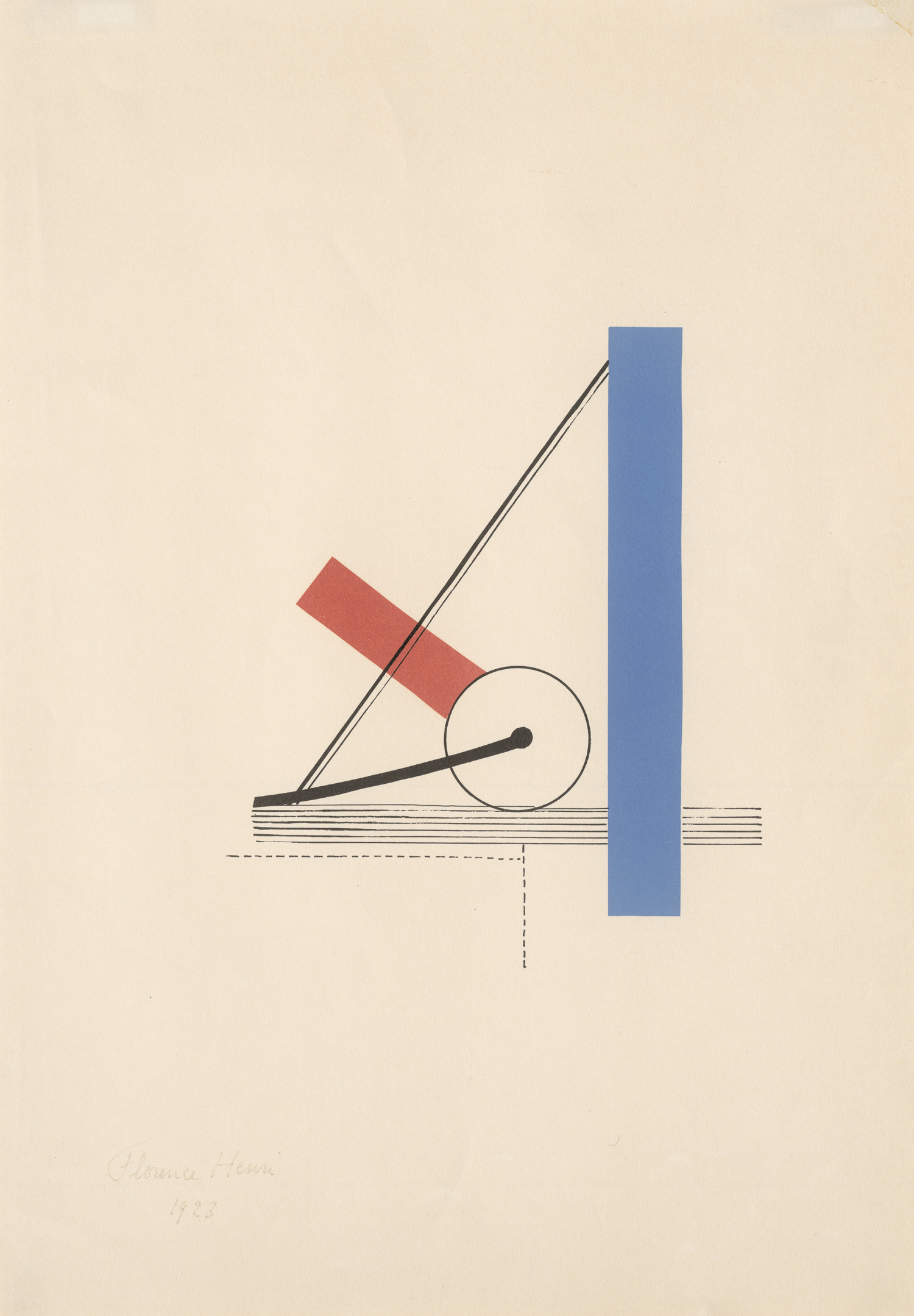 Geometrisch abstrahierte Komposition der avantgardistischen Künstlerin und Fotografin. Henri begann als Pianistin, nach dem Studium der Musik wandte sie sich der Malerei zu. In Berlin besuchte sie die Kunstakademie und war 1922/23 Schülerin von Johannes Walter-Kurau. In Paris lernte sie an der Académie Moderne bei Fernand Léger und Amédée Ozenfant, um dann 1927 für einen Sommerkurs an das Bauhaus in Dessau zu gehen. Hier war Josef Albers einer ihrer Lehrer. Bei László Moholy-Nagy studierte sie schließlich Fotografie. Prachtvoller Druck mit breitem Rand.
