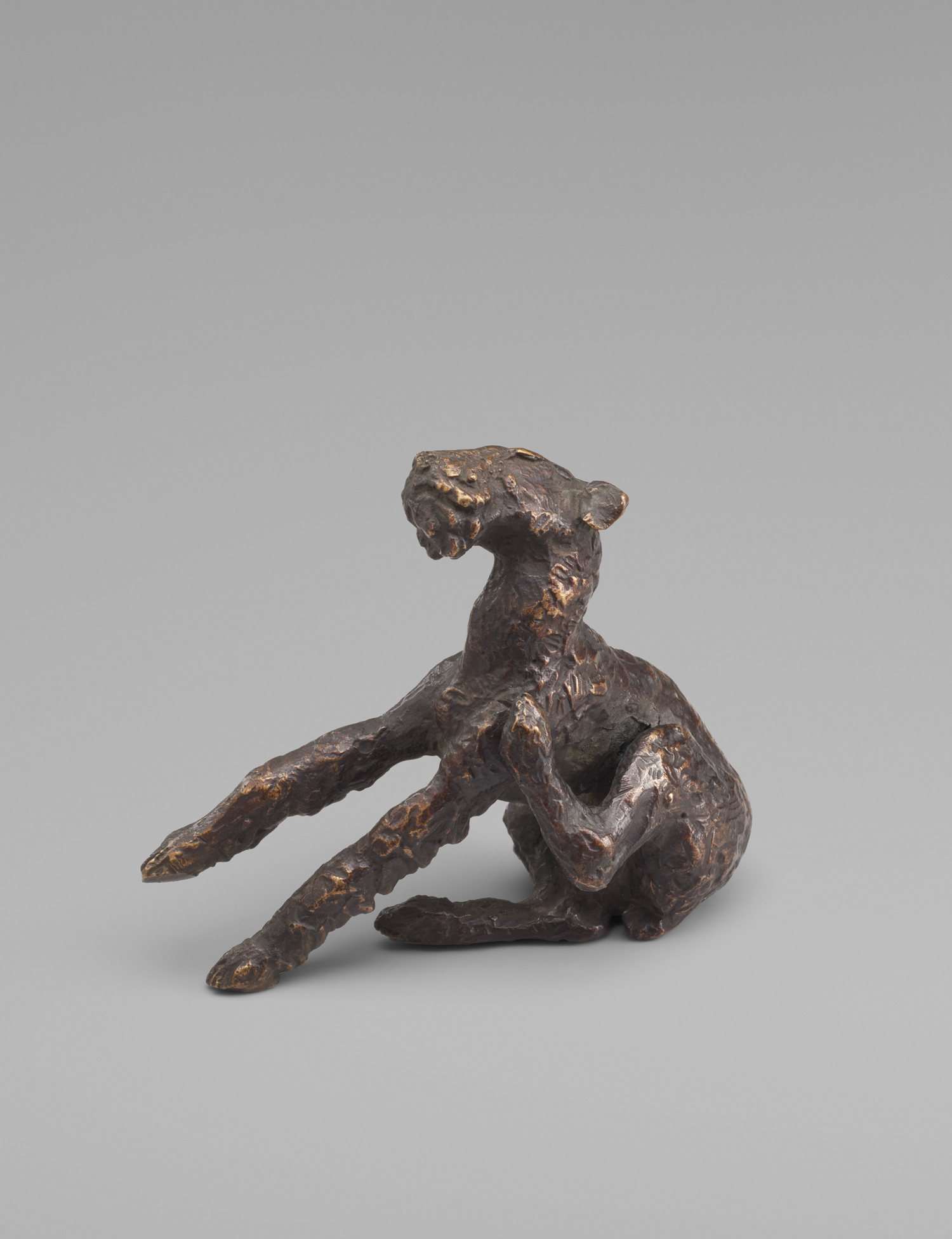 Zu Sintenis' bevorzugten Tiermotiven gehört der Terrier, den sie in zahlreichen Plastiken in den unterschiedlichsten Positionen festhält. In unserer hübschen Kleinbronze zeigt sie den sitzenden, sich kratzenden Airedaleterrier. Die Kopfpartie und das zottelige Fell sind schön detailliert herausgearbeitet. "Ein ebenso inniges Verhältnis wie zu Pferden entwickelte Renée Sintenis zu Hunden. Zahlreiche Graphiken und Plastiken, die besondere Situationen oder typische Bewegungen der Tiere festhalten, sind Zeugnis ihrer intensiven Beobachtungen (...). Die munteren Terrier stehen der Künstlerin besonders nahe; ihre Darstellung bildet einen Schwerpunkt im Rahmen der Hundeplastiken." (Britta E. Buhlmann, Renée Sintenis. Werkmonographie der Skulpturen, S. 73). Prachtvoller, differenzierter Guss mit lebendiger Oberfläche und warmer, goldbraun changierender Patina.