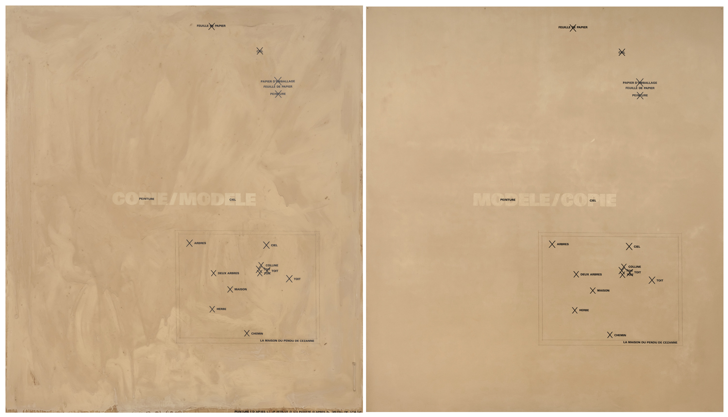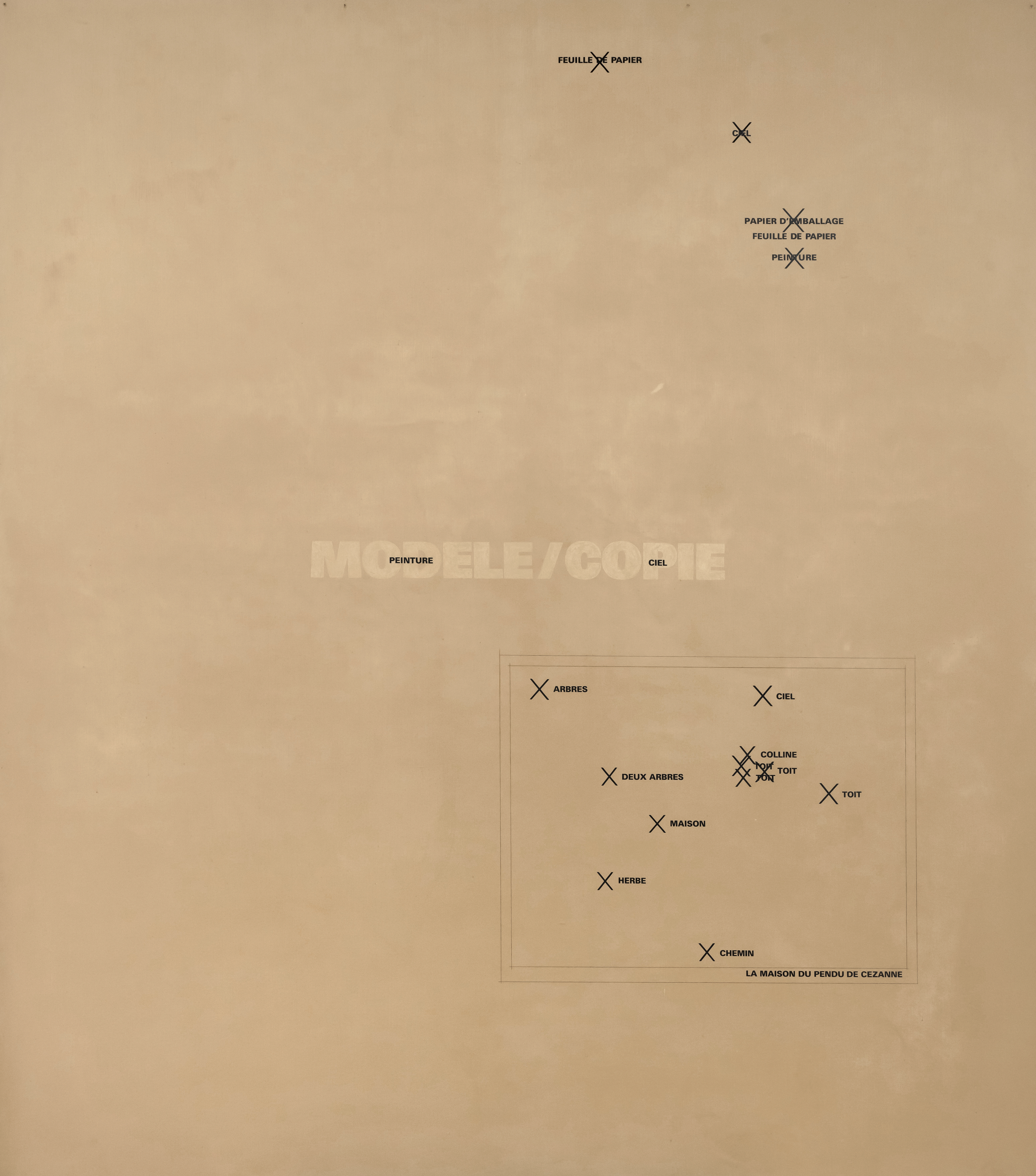 Die Arbeiten aus der Werkgruppe Une feuille de papier des Schweizer Malers und Konzeptkünstlers Rémy Zaugg verweisen auf das Offensichtliche: ein leeres Blatt, und zugleich auf das Fragezeichen, das mit dem Blick auf dieses scheinbar Unmittelbare verbunden ist. Das Papier wird zum Ausgangspunkt der Reflexion über Wahrnehmung, Form und Bedeutung. Ab 1973 beginnt Remy Zaugg Backpapiere, die er in seinem Atelier findet, mit Farbe in ähnlich bräunlichem Ton zu bedecken und einige wenige von ihnen auf Leinwand zu kaschieren. „In den auf diese Weise bemalten Papierbogen (erkennt Zaugg) die grundlegende Ambivalenz der Malerei, wie sie sich gegen Ende des 20. Jahrhunderts darstellt: Die braune Farbe verweist einerseits auf das braune Papier, das ihr Träger ist, anderseits auf sich selbst; sie repräsentiert das Blatt Papier und sie ist selbst als Material präsent.“ (Gerhard Mack, Rémy Zaugg. Eine Monographie, 2005, S. 88). Über Jahre arbeitete der Künstler an der für ihn unabschließbaren Werkgruppe, da im künstlerischen Prozess immer neue Bedeutungsnuancen für den Künstler sichtbar wurden. So verbindet Zaugg das übermalte Papier seit Ende der 1970er Jahre mit einzelnen Wörtern, welche häufig, als Gebrauchsanweisungen übereinandergelegt, ein unentwirrbares Gemisch aus Bezügen bilden. Mit Sprache „projiziert (er) Gemälde anderer Maler, die sich bereits auf Gemälde wiederum anderer Maler beziehen, auf das Papier und paraphrasiert sie mit brauner Farbe“ (Gerhard Mack, S. 89). Unsere zweiteilige Arbeit enthält den Titel eines Gemäldes von Paul Cézanne, welches 1874 auf der ersten impressionistischen Ausstellung in Paris präsentiert wurde. Während Zauggs vierzigjähriger Karriere, die in den 1970er Jahren begann, beschäftigte sich der Künstler intensiv mit der menschlichen Wahrnehmung. Seine Gemälde, Arbeiten auf Papier, öffentlichen Skulpturen, architektonischen Entwürfe, kuratorischen Arbeiten und Kritiken untersuchen, wie Sehen und Bewusstsein miteinander verbunden sind. Am bekanntesten ist er für seine textbasierten Gemälde in verschiedenen Sprachen.