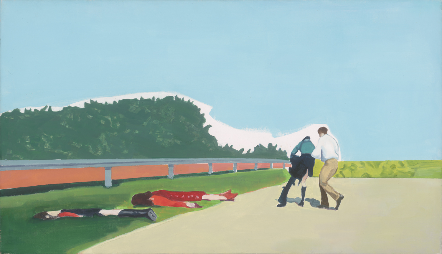 Filmsequenzen manipuliert die Künstlerin am Computer, arrangiert sie um und setzt ihre mysteriösen Figuren, Leichen, Kämpfende oder Flüchtende, in eine sommerlich-helle Landschaft. Wie in einem film-still erscheinen die Gestalten erstarrt inmitten ihrer Bewegung am Rande oder auf der Landstraße. Flächig aufgetragene, leuchtende Farben verleihen der "Weak end"-Serie eine zunächst heitere Stimmung, die bei näherer Betrachtung der leicht stilisierten Figuren kippt. Partien der Leinwand bleiben weiß und verdeutlichen das Prozessuale der Entstehung. "Christine Webers Bilder zeichnet eine fröhliche Gefasstheit, eine Friedhofsheiterkeit aus; gepaart mit jenem Voyeurismus, der Anklänge an die Berichterstattung bei Unfällen oder Kriegen zulässt, und nicht zuletzt der daraus resultierenden sublimen Erotik des entkleidenden Blicks." (Lokiev Stoof, abelneuekunst.de, Zugriff 15.09.2025). Als Vorlage ihrer Serie dient Weber Jean-Luc Godards Film "Weekend" aus dem Jahr 1967.