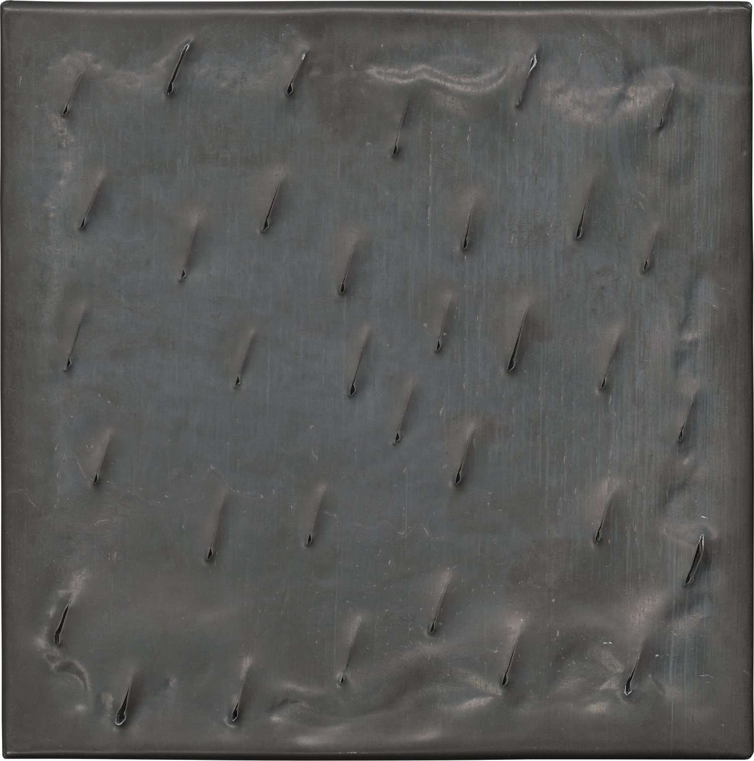 Verschiedene Materialien wie Glas, Spiegel und Blei waren bevorzugte Elemente von Bonatos Arbeit und finden sich hier in einer effektvollen Kombination. Die mit kräftigen Hieben perforierte Bleiplatte lässt tief in den Löchern das Spiegelglas schimmern.