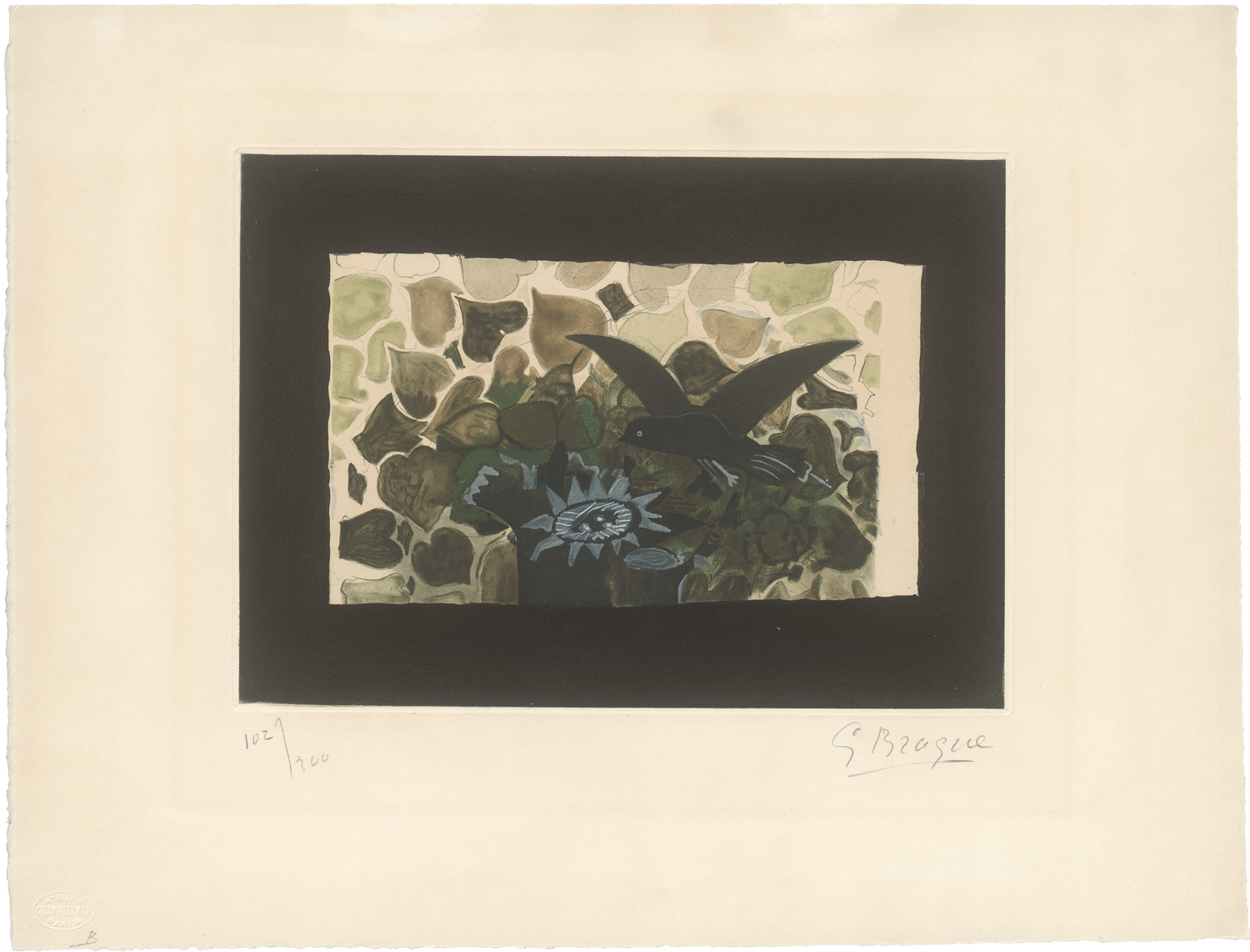 Unten links mit dem Blindstempel "ATELIER CROMMELYNCK PARIS". Aus der Reihe von Graphiken nach Gemälden von George Braque und unter dessen Aufsicht gedruckt, verlegt von Maeght, Paris. Kräftiger Druck wohl mit dem vollen Rand, an zwei Seiten mit Schöpfrand.